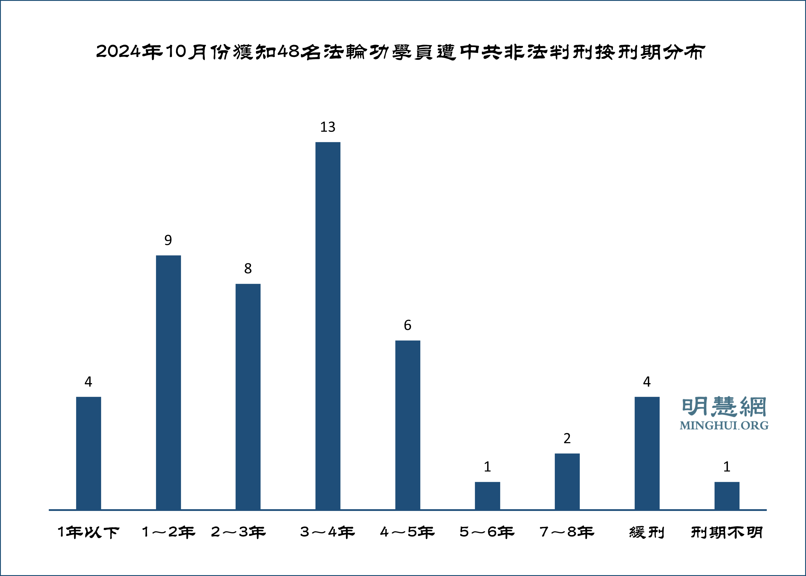 ![]() 图1:2024年10月份获知48名法轮功学员遭中共非法判刑按刑期分布 |