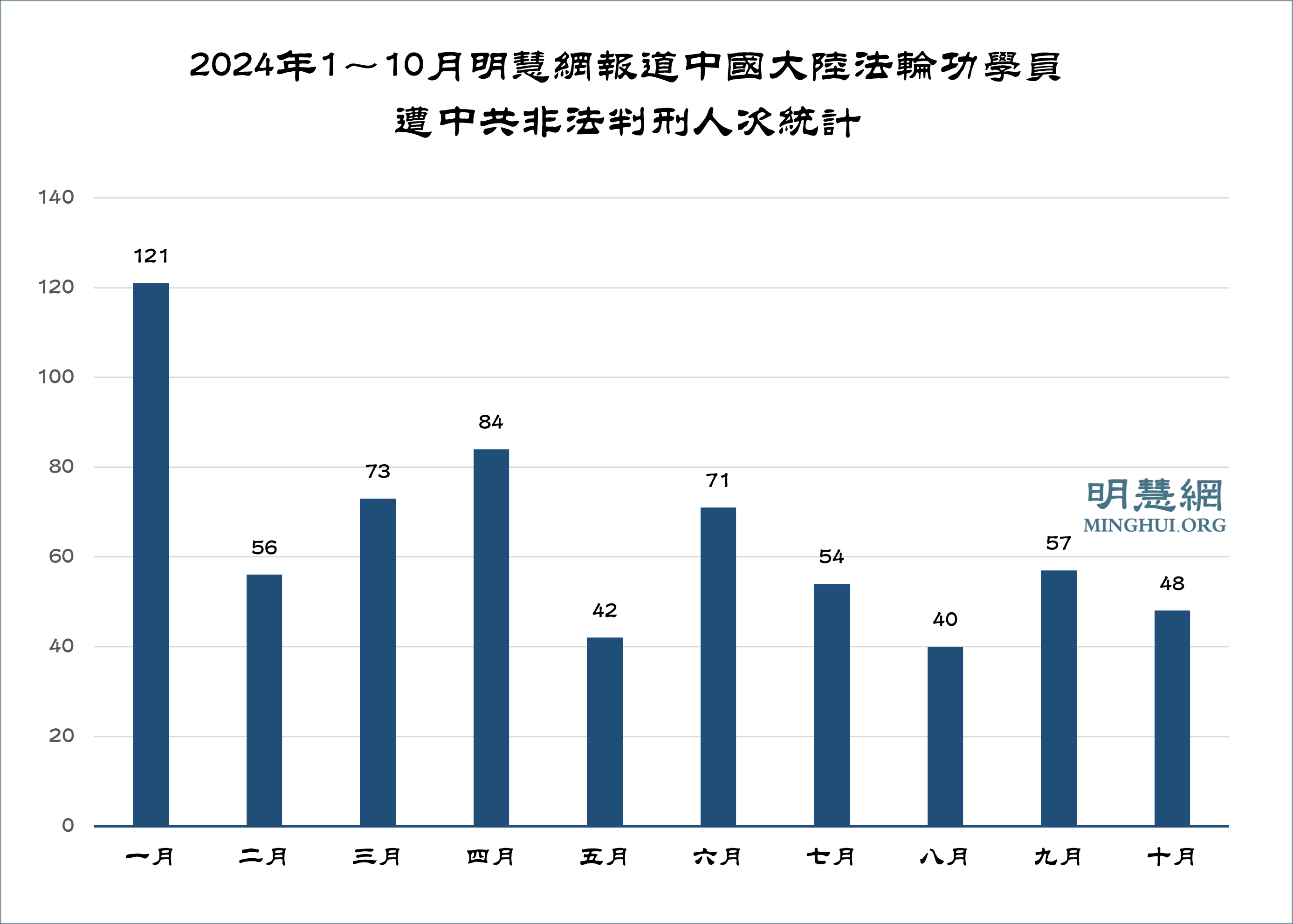 ![]() 图3:2024年1~10月明慧网报道中国大陆法轮功学员遭中共非法判刑人次统计 |