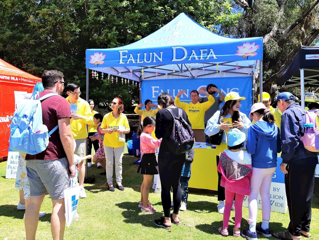 学员在展位上介绍法轮功并演示五套功法,传递真、善、忍的美好,讲述法轮功学员受中共迫害的真相。络绎不绝的游客被法轮大法展位吸引,人们接过真相资料,了解法轮功,并在制止中共迫害法轮功的征签簿上签名,支持法轮功学员和平反迫害。很多人对学炼功法感兴趣,询问当地炼功点。在大法展位附近有一个扶轮社展位,他们目睹来法轮大法展位参观的游客特别多,其中的一名扶轮社成员走过来对法轮功学员说:“你们做得很棒。”