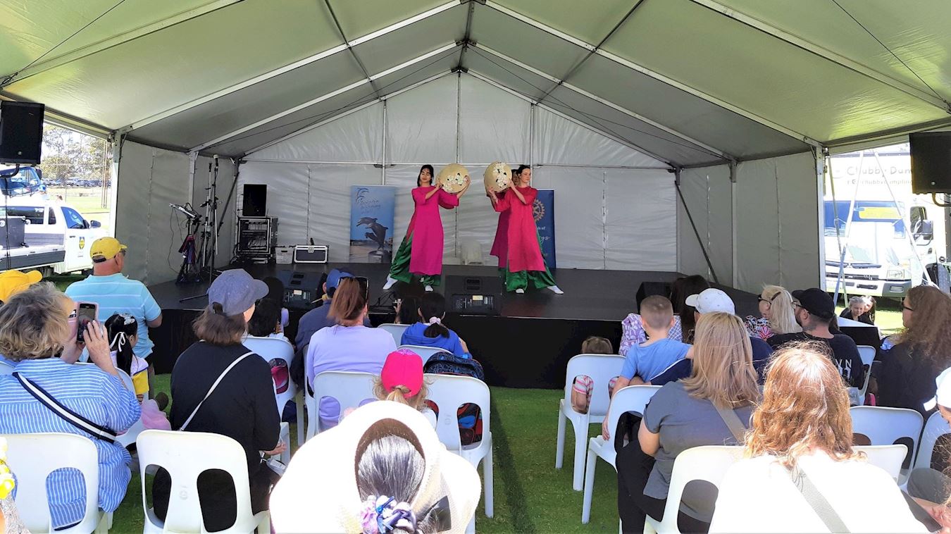 ![]() 图8:西澳法轮功学员在卡琳社区博览会舞台上为观众表演越南斗笠舞。 |