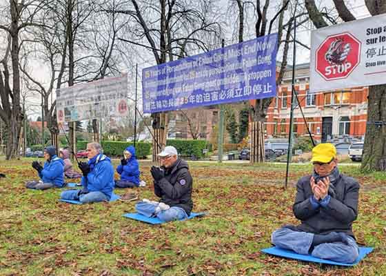 世界人权日之际,比利时法轮功学员在布鲁塞尔中使馆前反迫害,他们打出“法轮大法好”、“解体中共 停止迫害”等横幅。