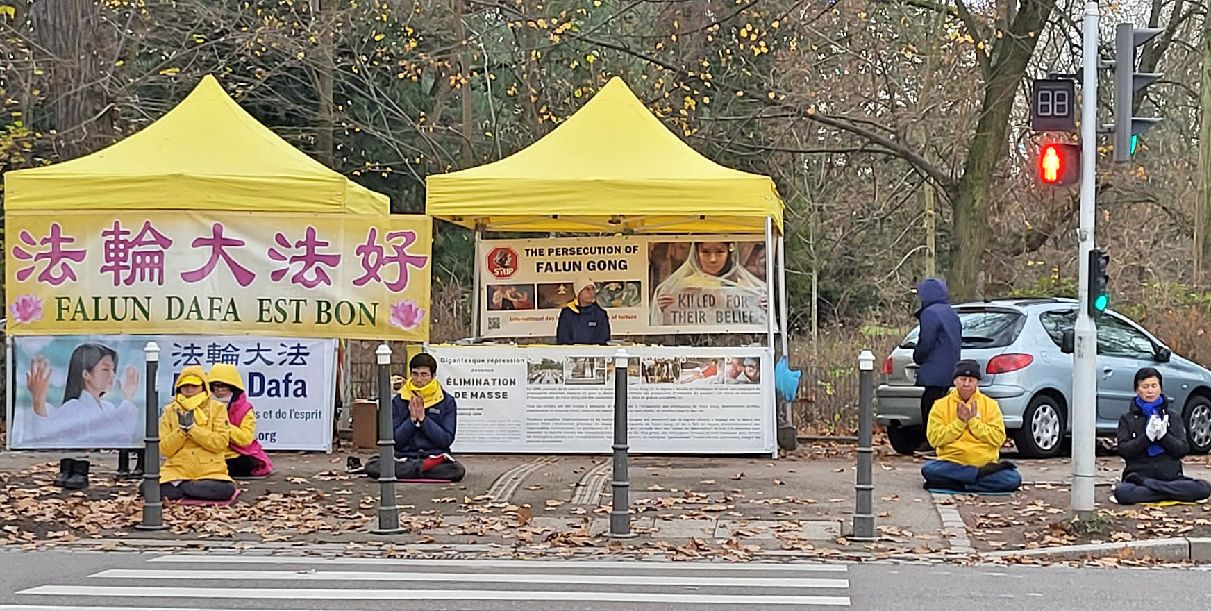 艾琳·戈塞特(Irene Gosset)散步途径活动场地,她与法轮功学员交谈。今天看到法轮功学员能够在严寒中平静地打坐炼功,令她感到惊讶和钦佩,她觉得法轮功学员很勇敢。她家住在附近,她说经常见到法轮功学员在此活动,她已经知道一些中共迫害法轮功的情况,她非常认同真、善、忍理念,她说:“这个世界需要真、善、忍。中国法轮功修炼者所遭受的惨痛经历,令人震惊。”