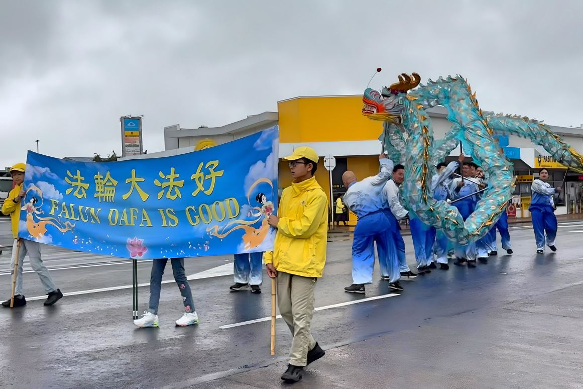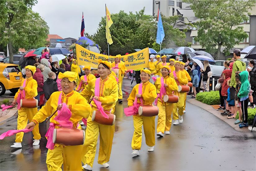 最后,他想对参加游行的法轮功学员说:“我简直不敢相信你们竟然从奥克兰专程远道而来,真是太好了,感谢你们的热忱。我非常感谢你们的到来,并且在雨中坚持(演奏)。”