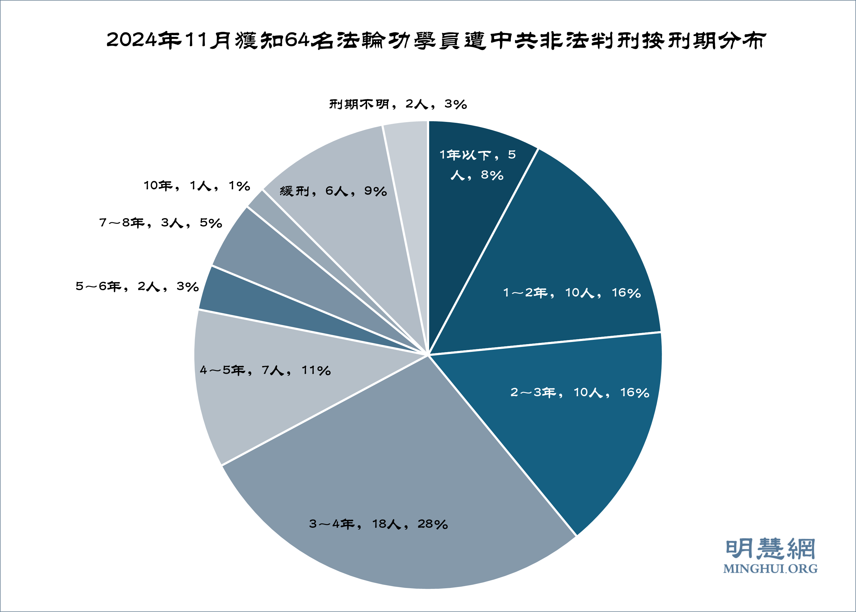 ![]() 图2:2024年11月获知64名法轮功学员遭中共非法判刑按刑期分布 |