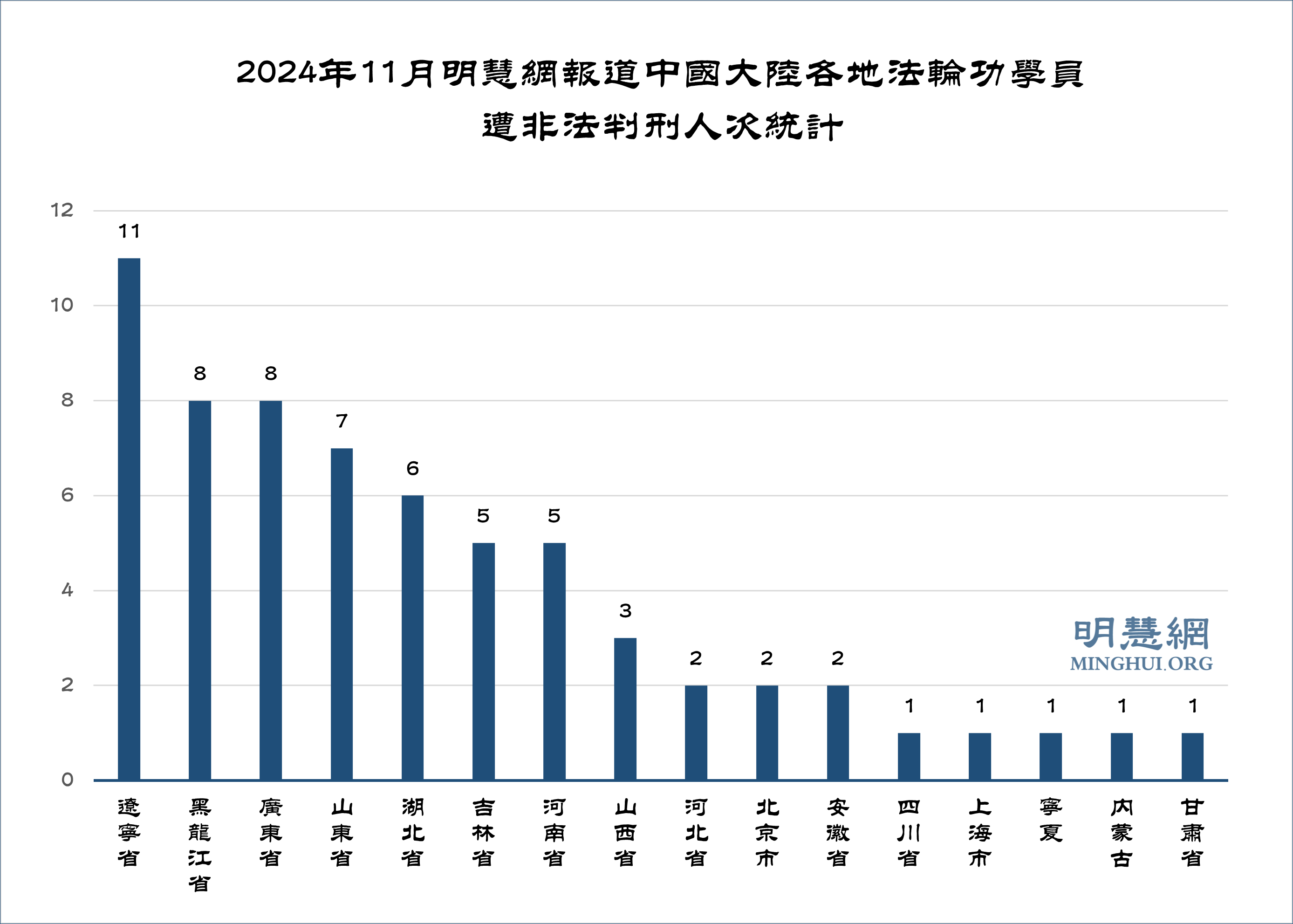 ![]() 图3:2024年11月明慧网报道中国大陆各地法轮功学员遭非法判刑人次统计 |