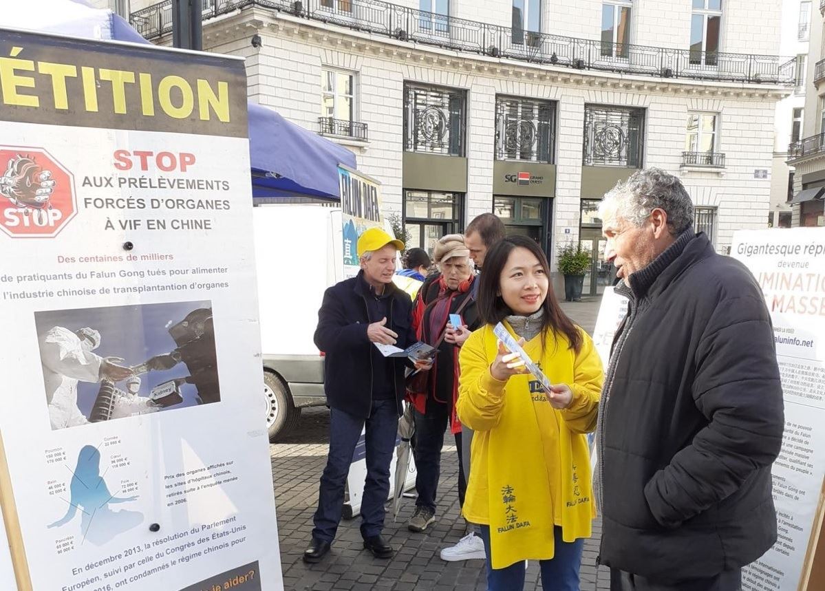 皇家广场是南特市举办艺术展览、节日活动或政治集会的场所。当天时雨时晴,人们被法轮功学员的腰鼓表演所吸引前来询问。当人们得知,中国的法轮功修炼者因信仰真、善、忍而遭到监禁,很多人深受触动,立刻在反迫害请愿书上签字。他们还希望深入了解法轮功及其带来的好处,有人表示,中共对法轮功学员的残暴行径应当立刻停止。