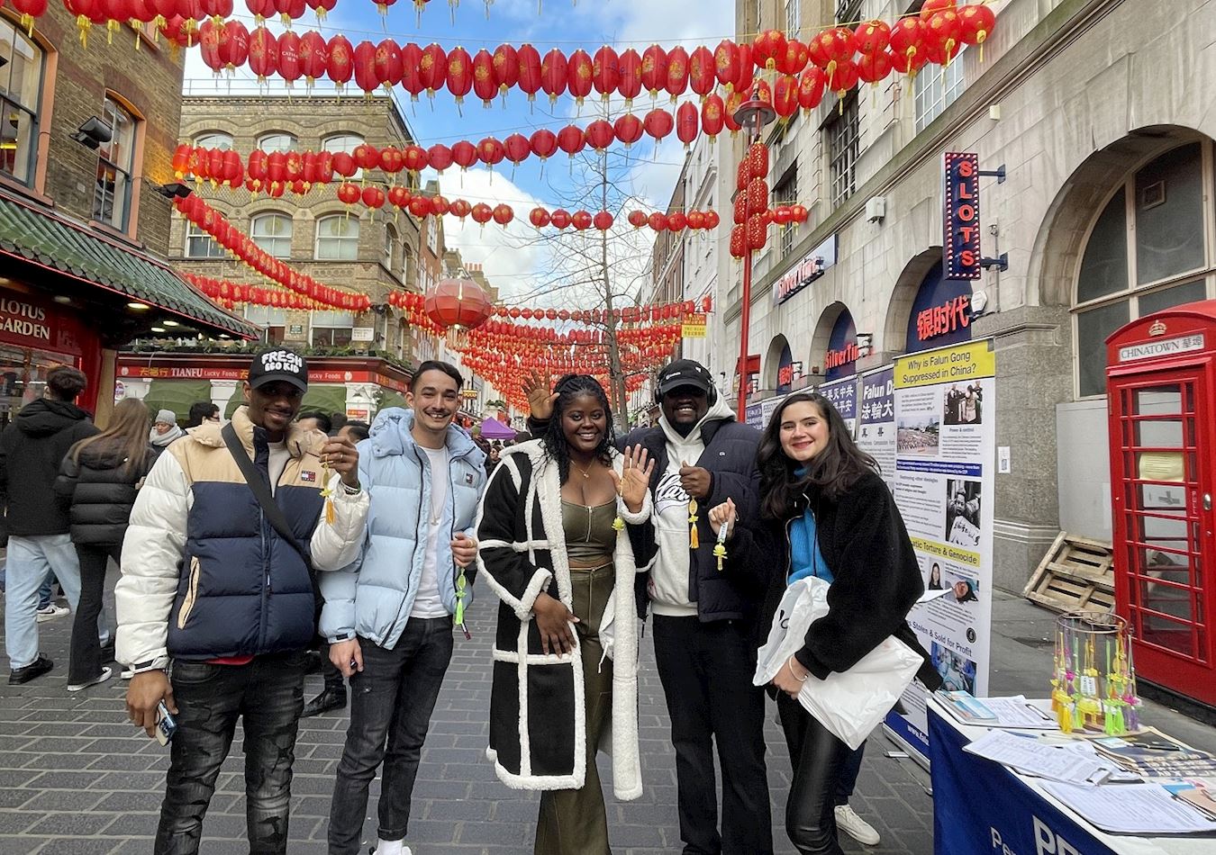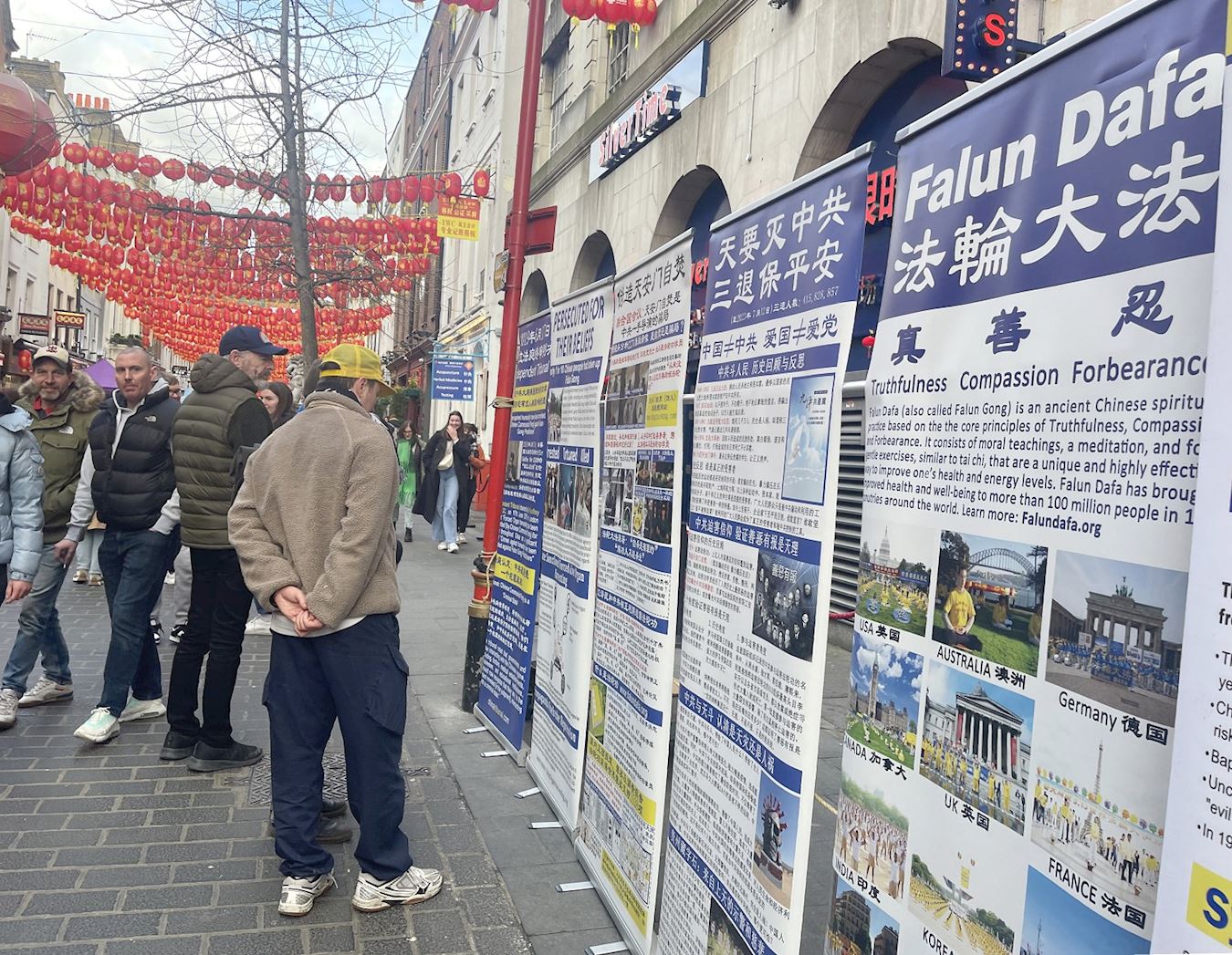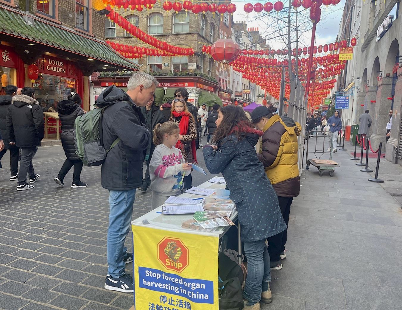 【明慧网二零二四年二月二十七日】二零二四年二月二十四日元宵佳节,英国伦敦唐人街张灯结彩一片喜洋洋的气氛,人们络绎不绝来此感受节日气氛。法轮功学员在这个繁华热闹的旅游景点上弘法讲真相,揭露中共迫害法轮功的事实。明白真相的市民及游客纷纷在反迫害征签表上签名支持法轮功。