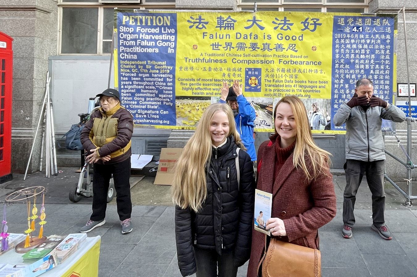 曾在北京新闻媒体工作的张女士,来到法轮功真相点,和学员交谈过程中,她告诉学员,在国内她深知中共管制的媒体造假说谎是常态,明白象“天安门自焚”这样的假新闻是如何炮制出来的。她带着儿子、父亲和母亲到唐人街过元宵节,十二岁的儿子刚到英国留学。他们想了解法轮功的情况。