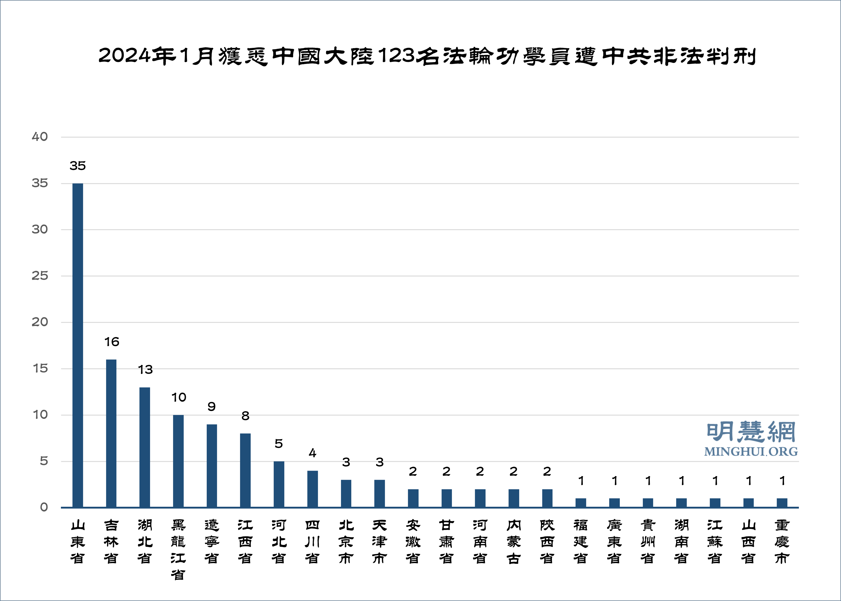 根据明慧网报道统计,二零二四年一月份获知,中国大陆至少有123名法轮功学员被非法判刑,分布于22个省、自治区、直辖市,其中有47名60岁以上的老年法轮功学员,年龄最长者85岁。