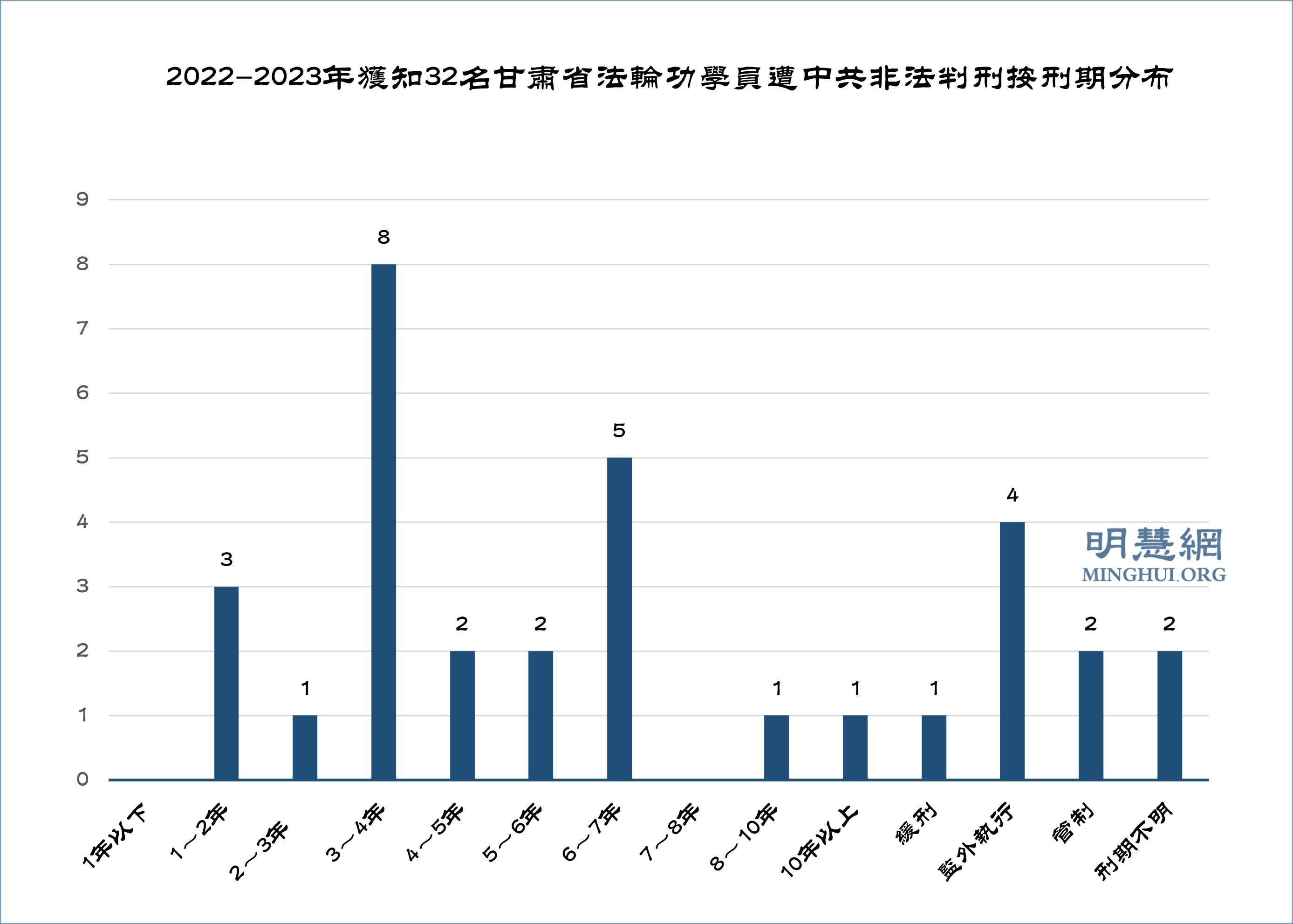 ![]() 图3:2022-2023年获知32名甘肃省法轮功学员遭中共非法判刑按刑期分布 |