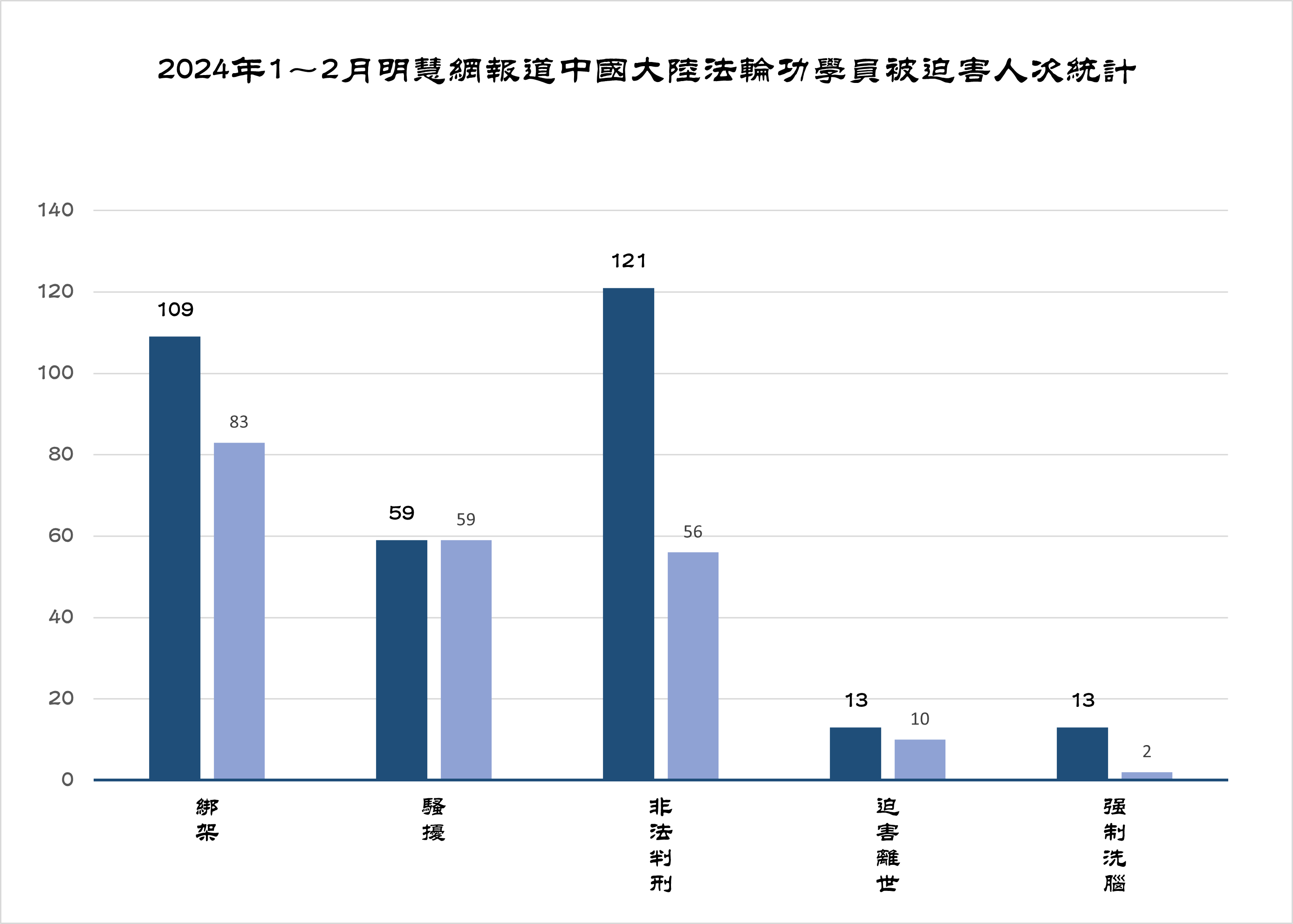 据明慧网报道统计,二零二四年一至二月份获知,至少310名法轮功学员被绑架和骚扰,其中绑架192人,骚扰118人,强制洗脑15人,有6人被迫离家出走,78人被非法抄家。