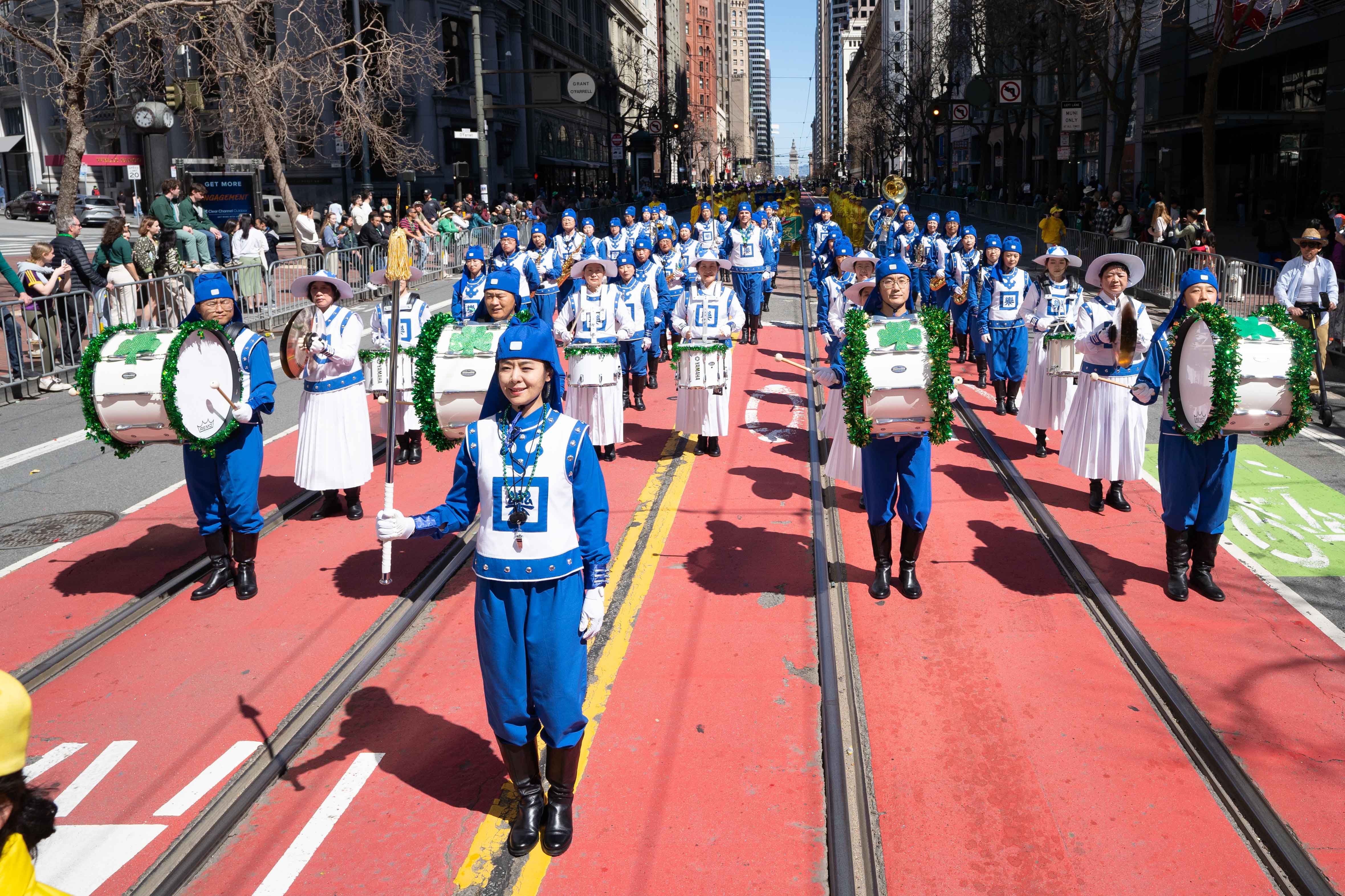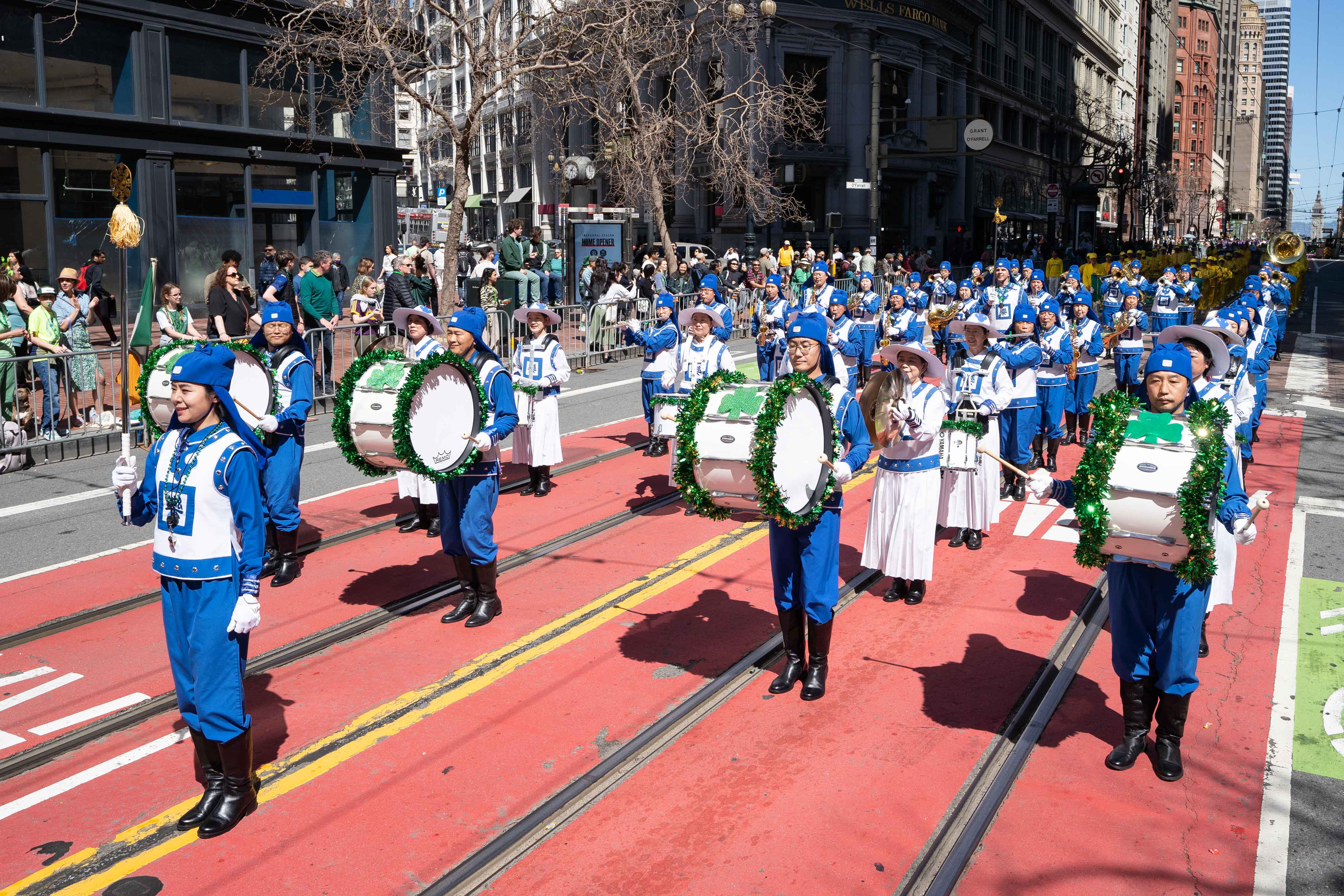参加旧金山圣帕特里克日游行的法轮功学员队伍是历年来阵容最大的,有法轮功炼功队、腰鼓队和美西天国乐团。许多观众随着天国乐团演奏的雄壮乐曲舞蹈着;有的高兴地跟法轮功学员的队伍一起拍照留念;还有的观众向法轮功学员竖起大拇指。