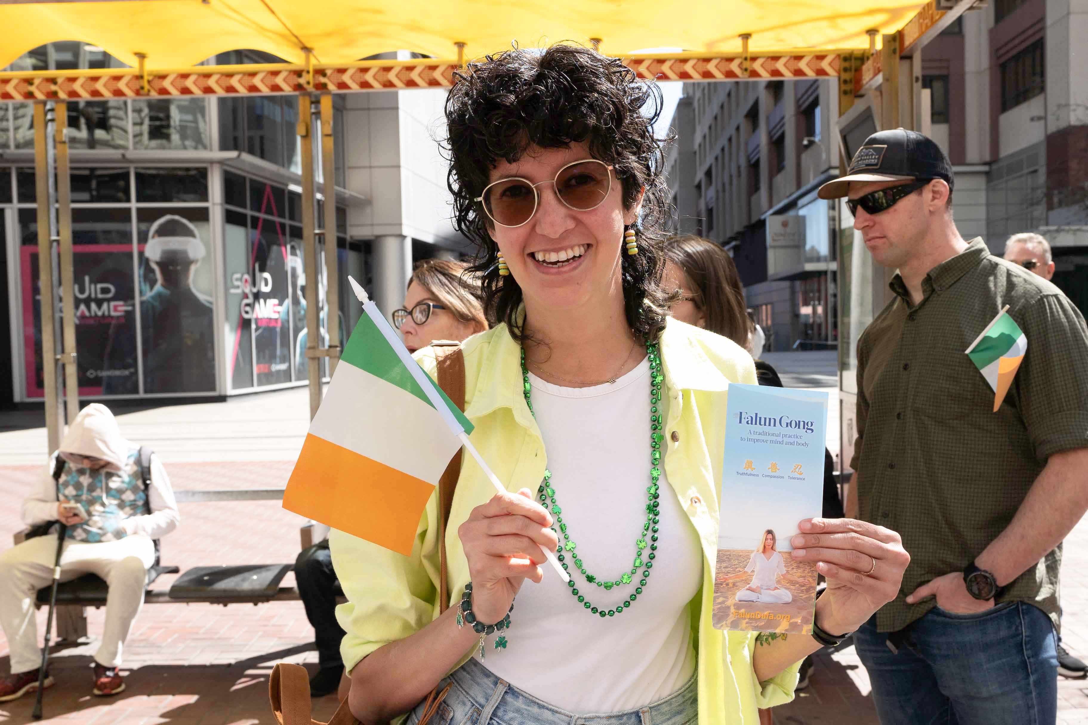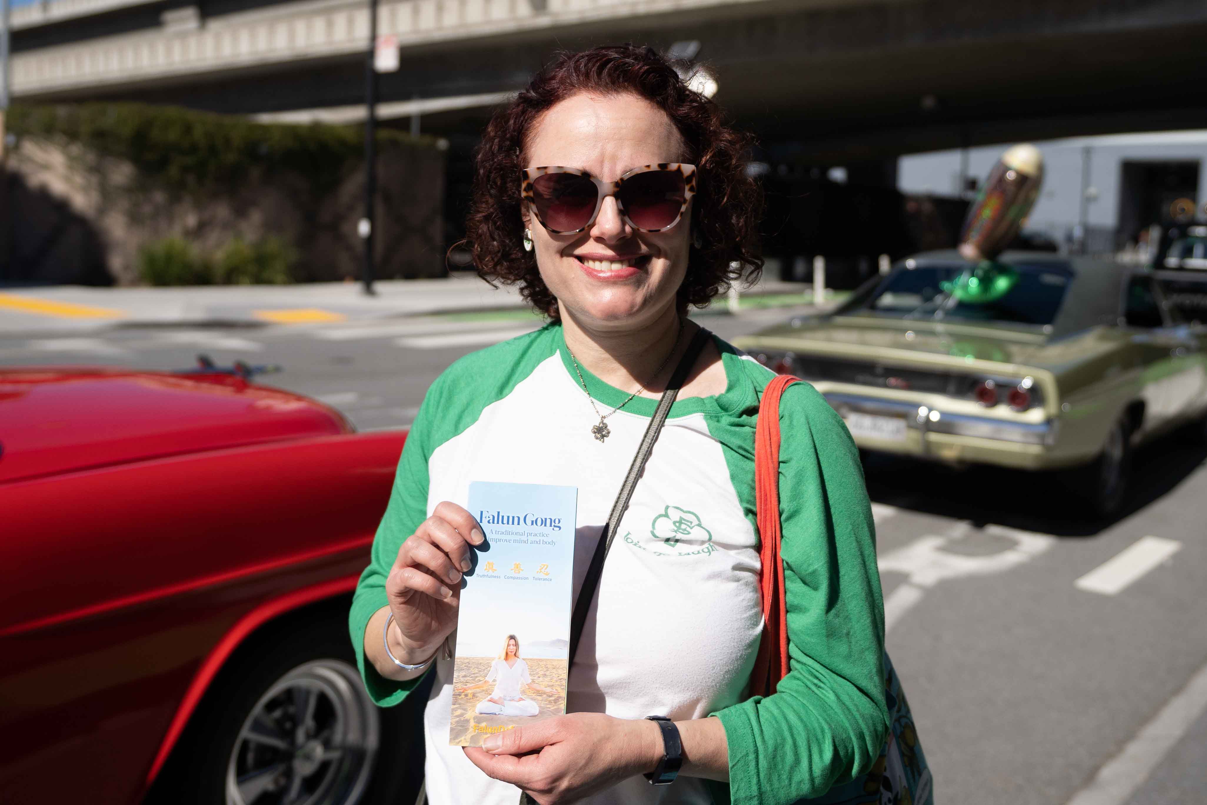 爱尔兰裔美国人Jaime O'Keefe也是游行队伍中汽车队的一员,听到法轮功,她非常高兴,她说,“非常高兴你们来参加游行,我知道法轮功非常平和,但在中国受到迫害。我非常高兴,你们可以在游行中向观众传递你们的信息。”