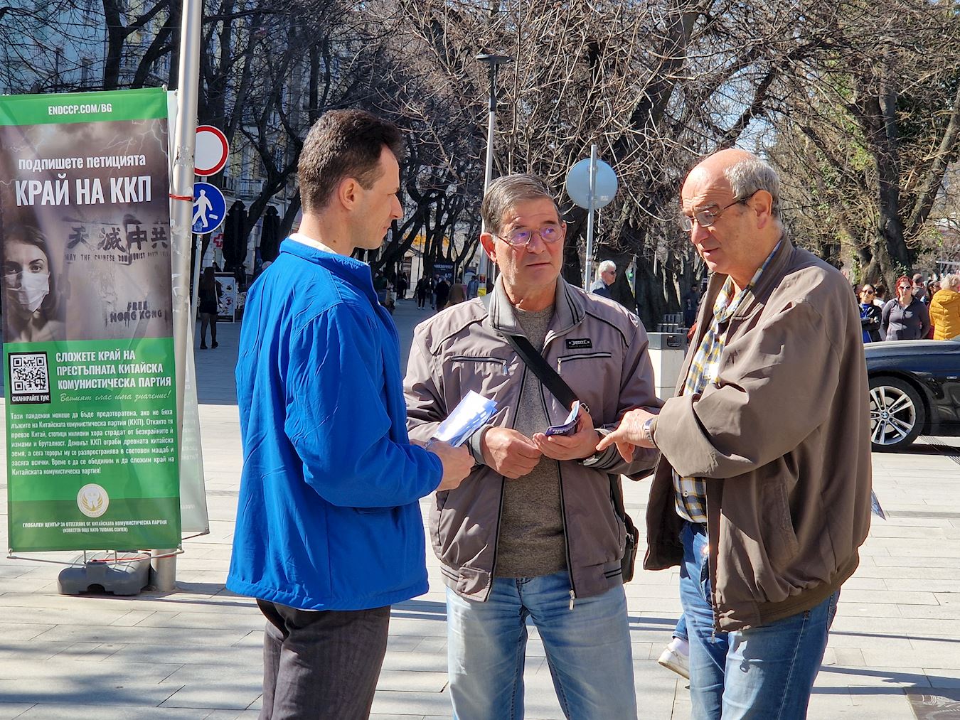 迪米塔尔(Dimitar)是当天第一个在请愿书上签名的人,他是一名学生,当学员问他是否愿意在请愿书上签名时,他回答说:“当然!”签名后,他与学员合影留念,并说道:“没有人可以对这场迫害无动于衷。”