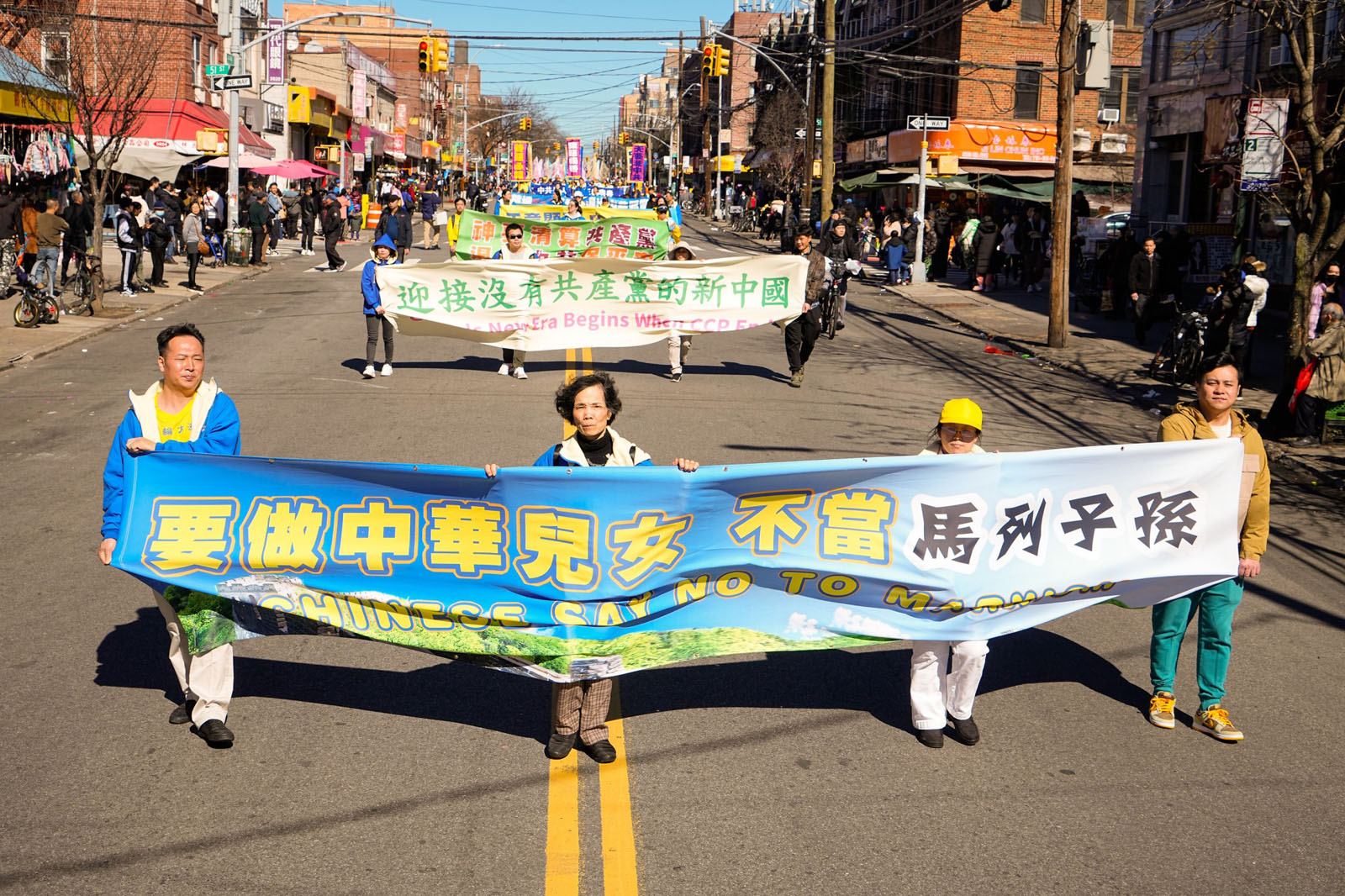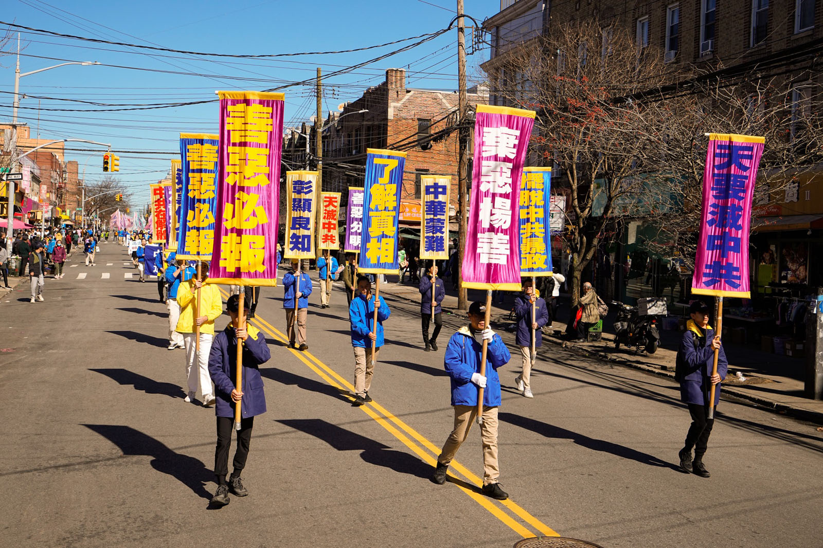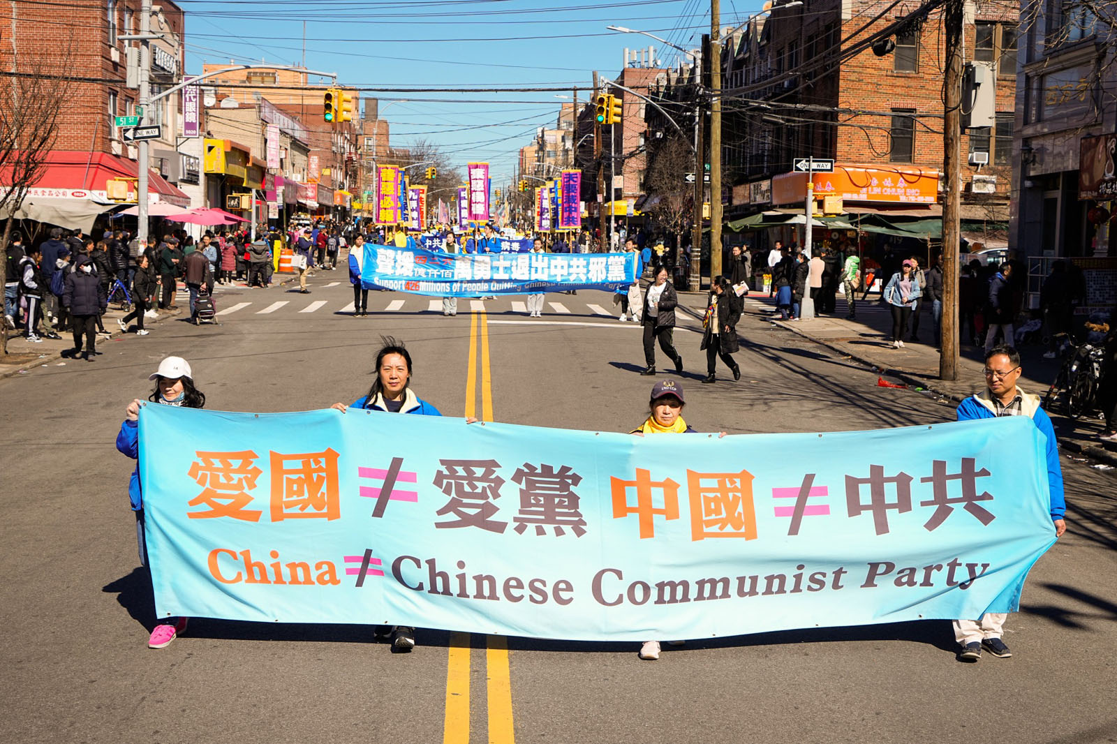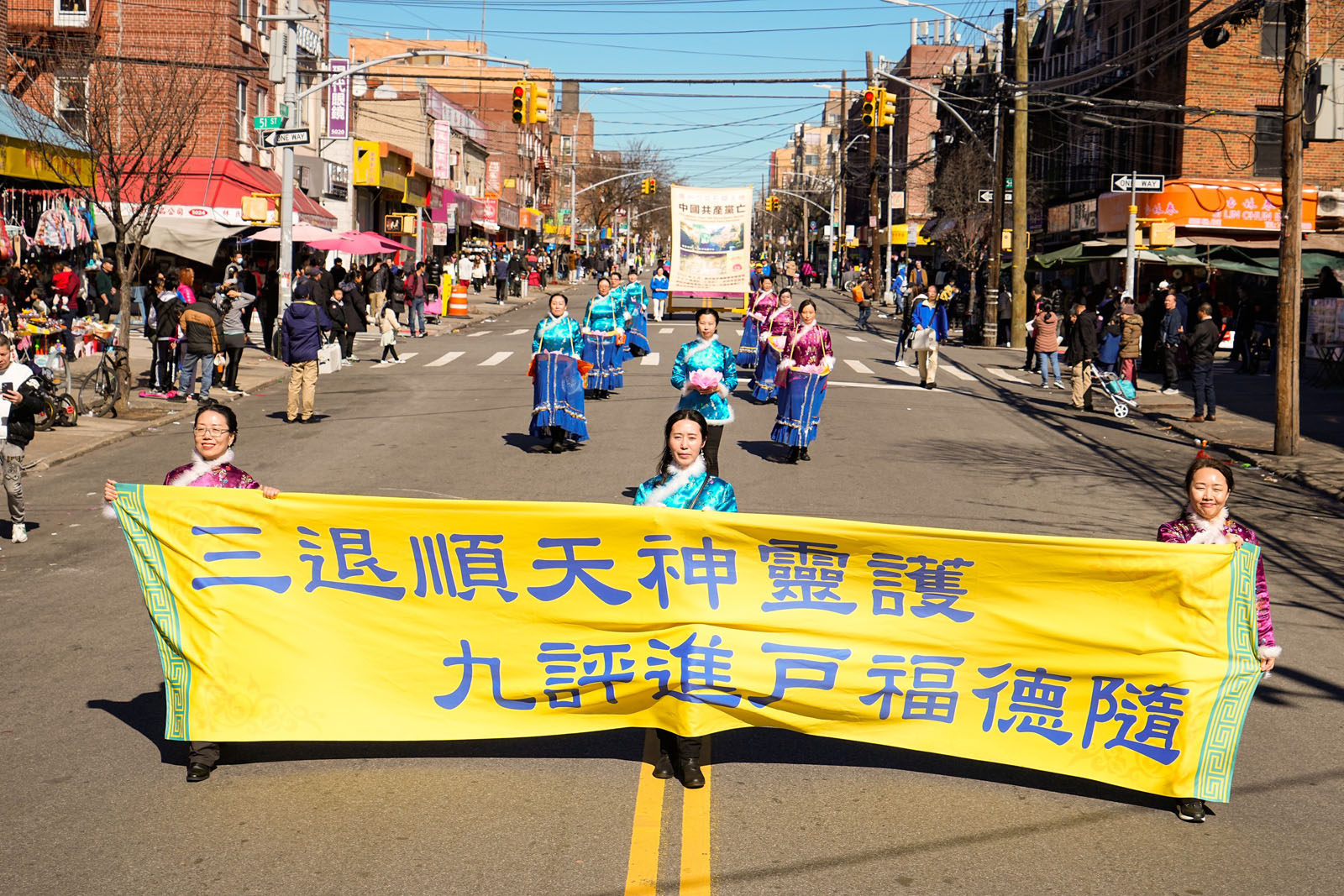 周末的八大道人声鼎沸,游行队伍从起点第四十一街到终点第五十九街,一直绵延了十几条街,整个社区喜气洋洋。庄严威武的乐队,欢舞飞腾的狮龙,彩旗飘扬,鼓声震天,横幅展板,花船腰鼓,场面殊胜壮观,震撼人心。众多市民及游客站在街头目不暇接,拍照、录像、喜迎真相。