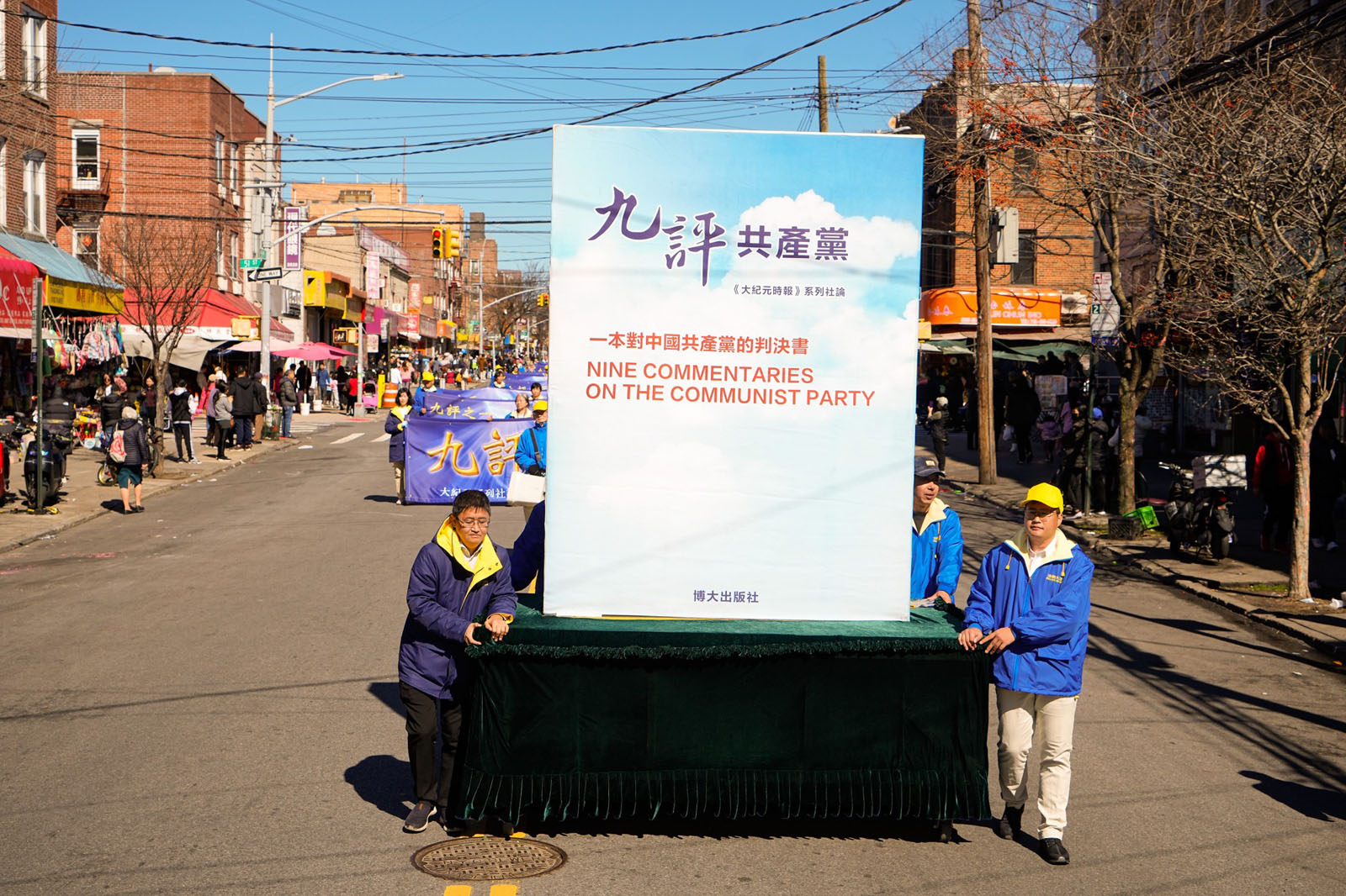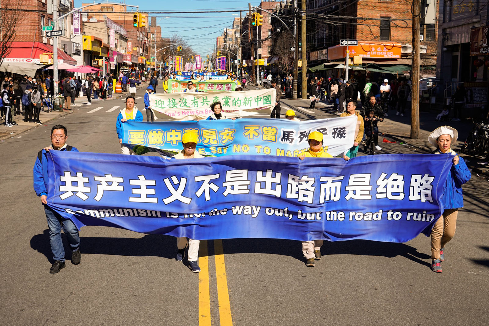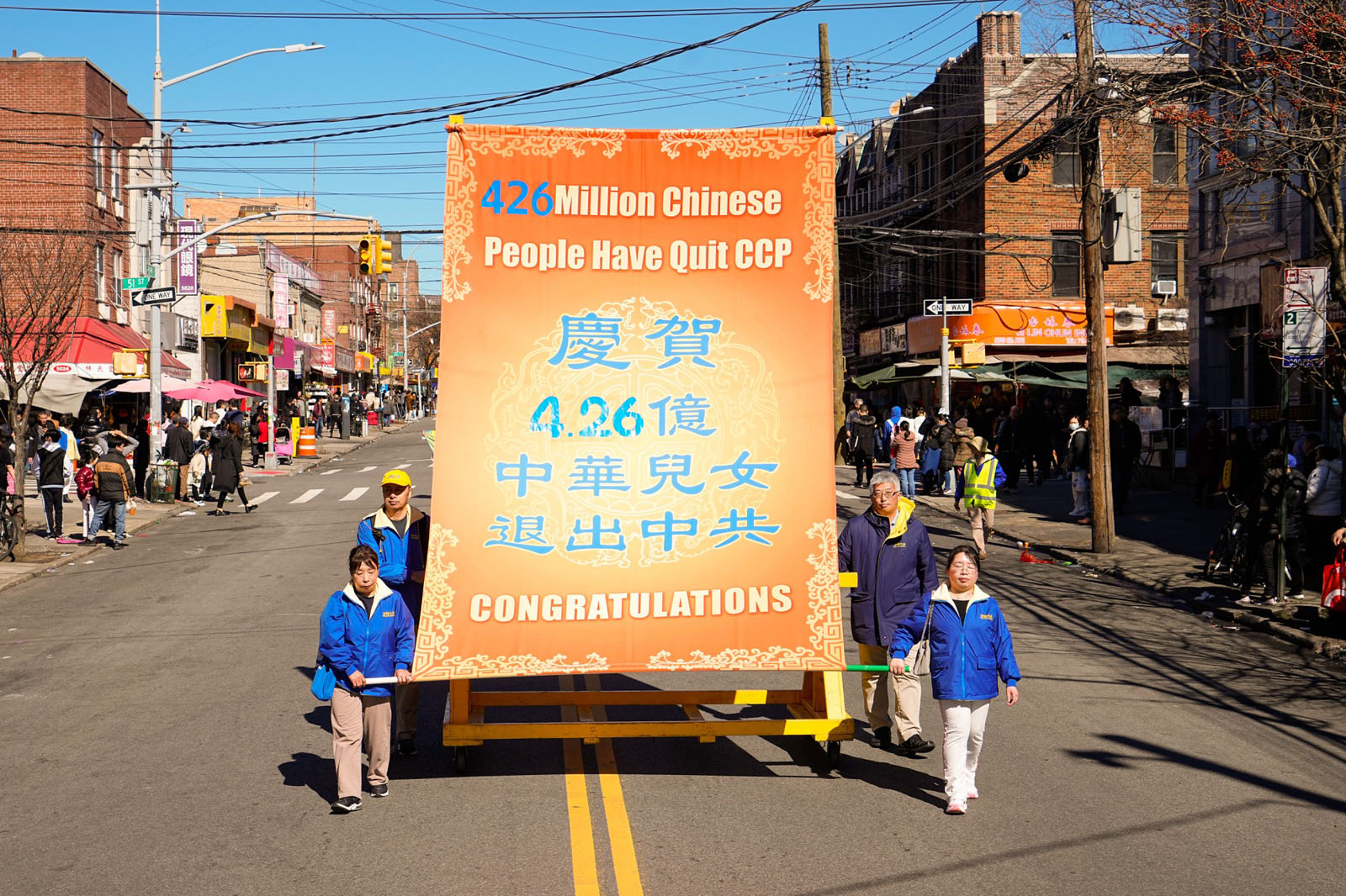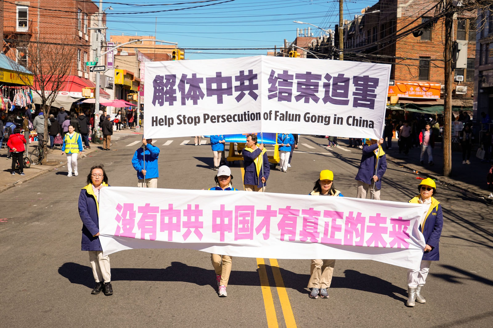 周末的八大道人声鼎沸,游行队伍从起点第四十一街到终点第五十九街,一直绵延了十几条街,整个社区喜气洋洋。庄严威武的乐队,欢舞飞腾的狮龙,彩旗飘扬,鼓声震天,横幅展板,花船腰鼓,场面殊胜壮观,震撼人心。众多市民及游客站在街头目不暇接,拍照、录像、喜迎真相。