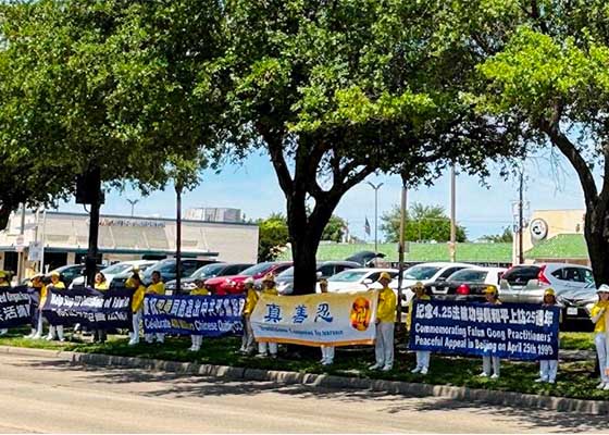 四月十三日,来自德州休斯顿的部分法轮功学员在中国城百利大道前举行集会,纪念万名法轮功学员“四·二五”和平上访二十五周年。