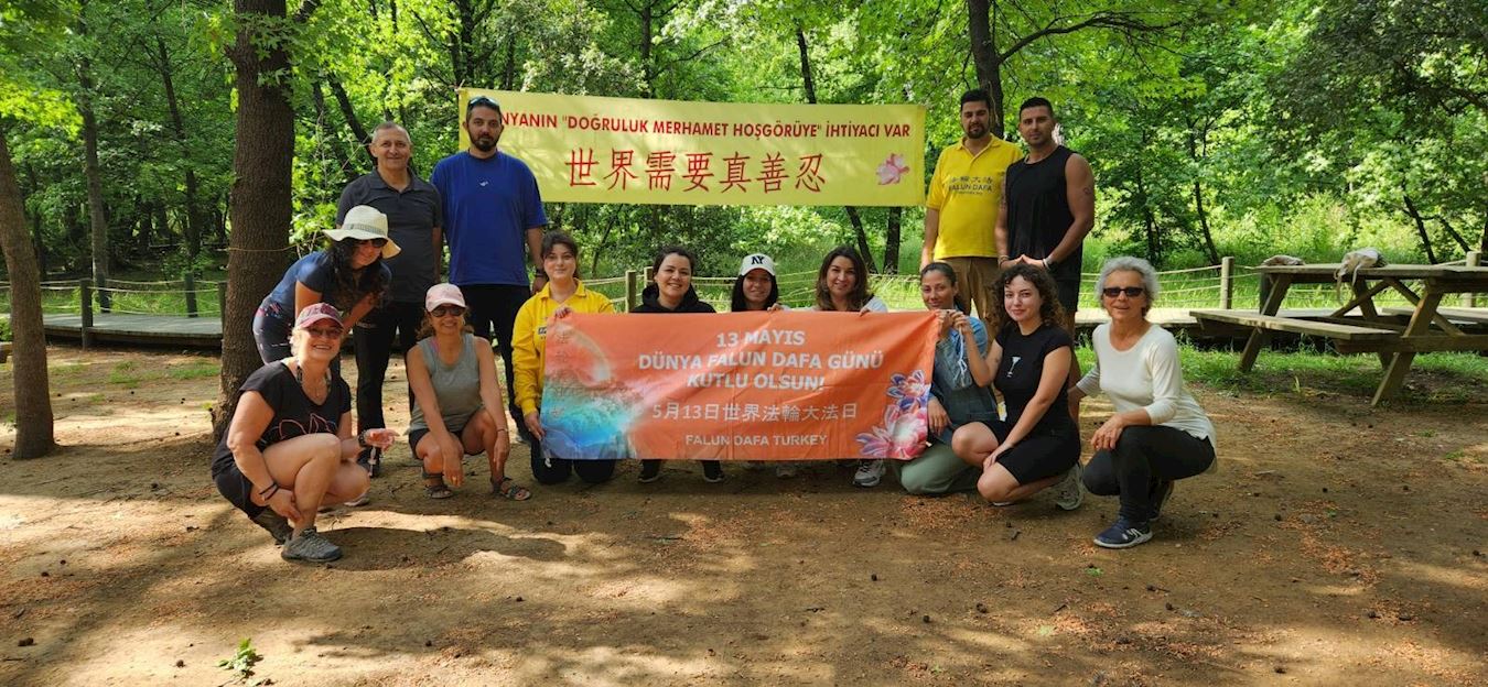 活动结束时,这些学功的民众和法轮功学员们一起,展开了横幅:“世界需要真善忍!”和“五·一三世界法轮大法日”,并拍摄了一张合影,以庆祝五月十三日“世界法轮大法日”和李洪志师父的生日。