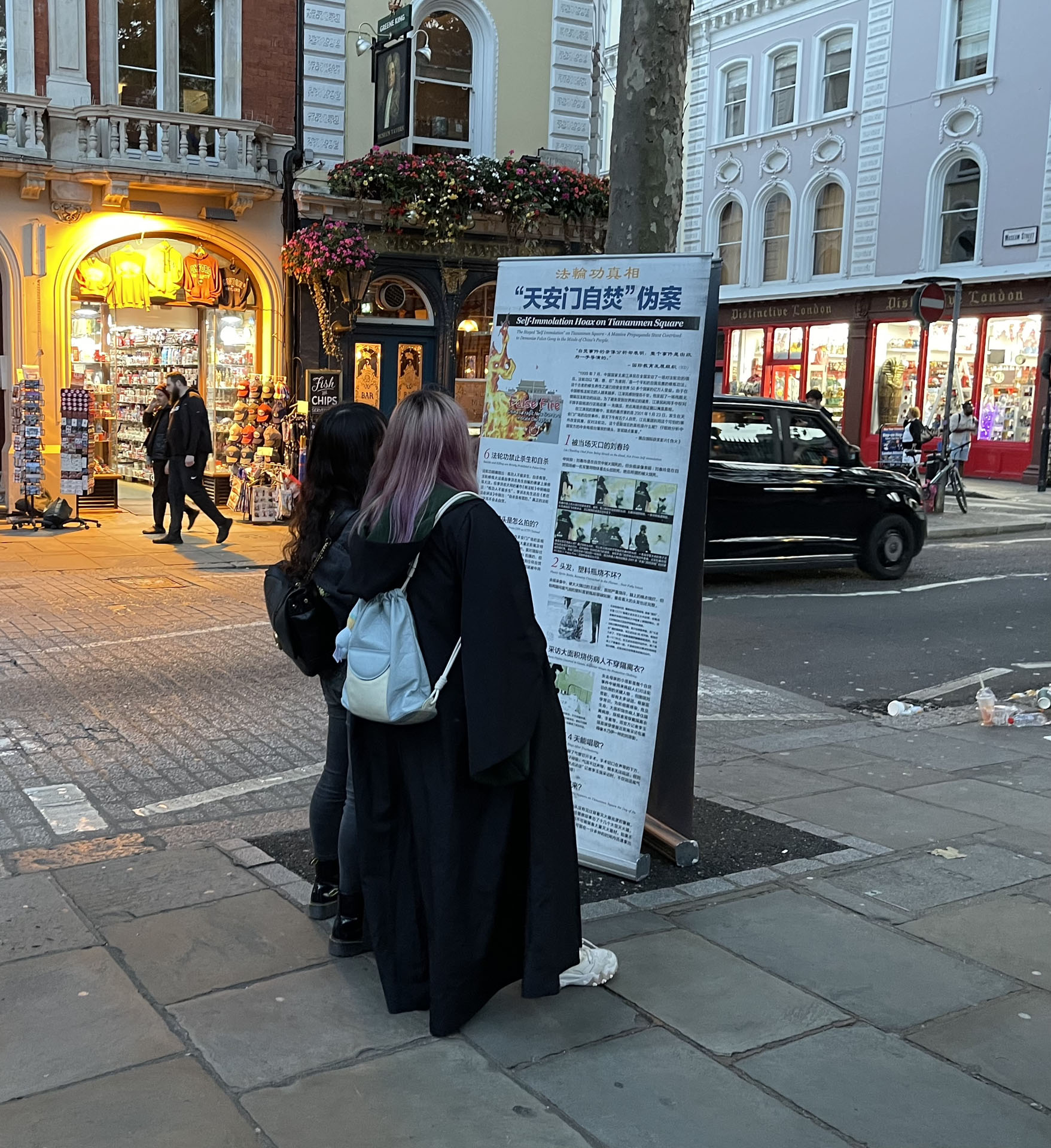 ![]() 图2:华人阅读天安门“自焚”真相展板 |