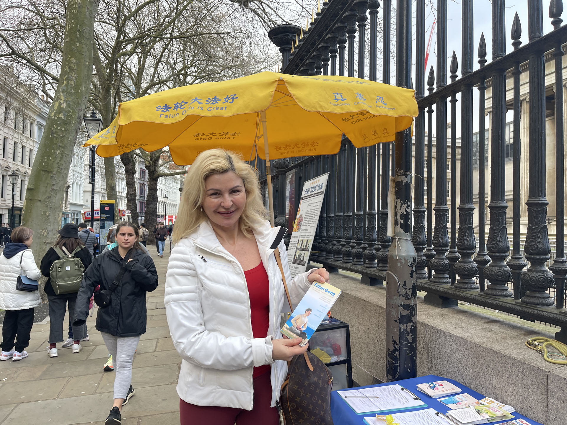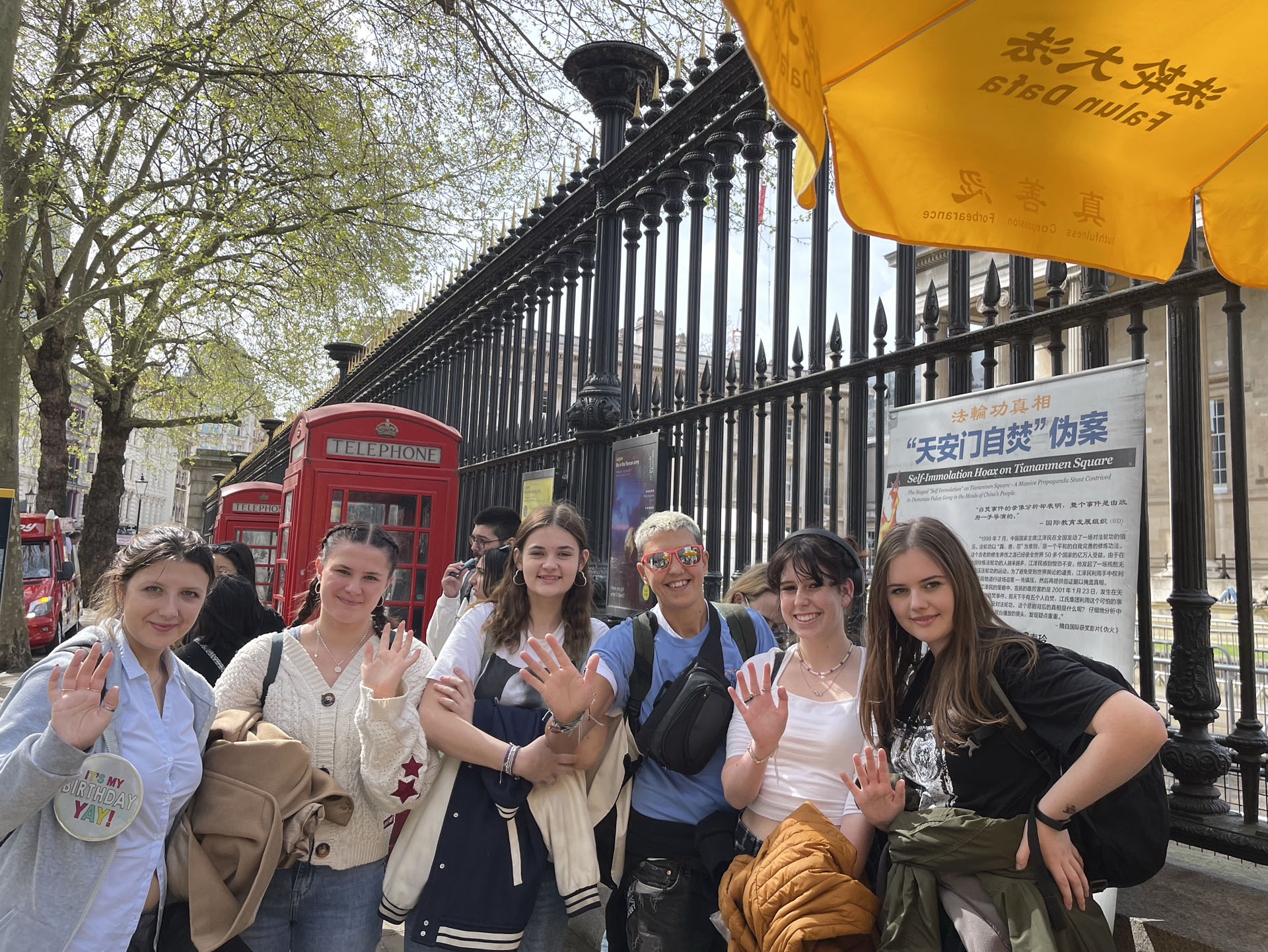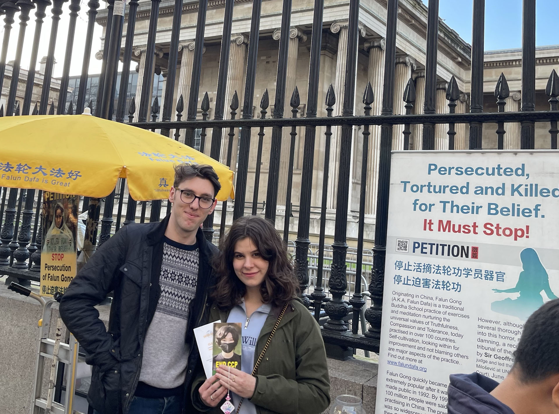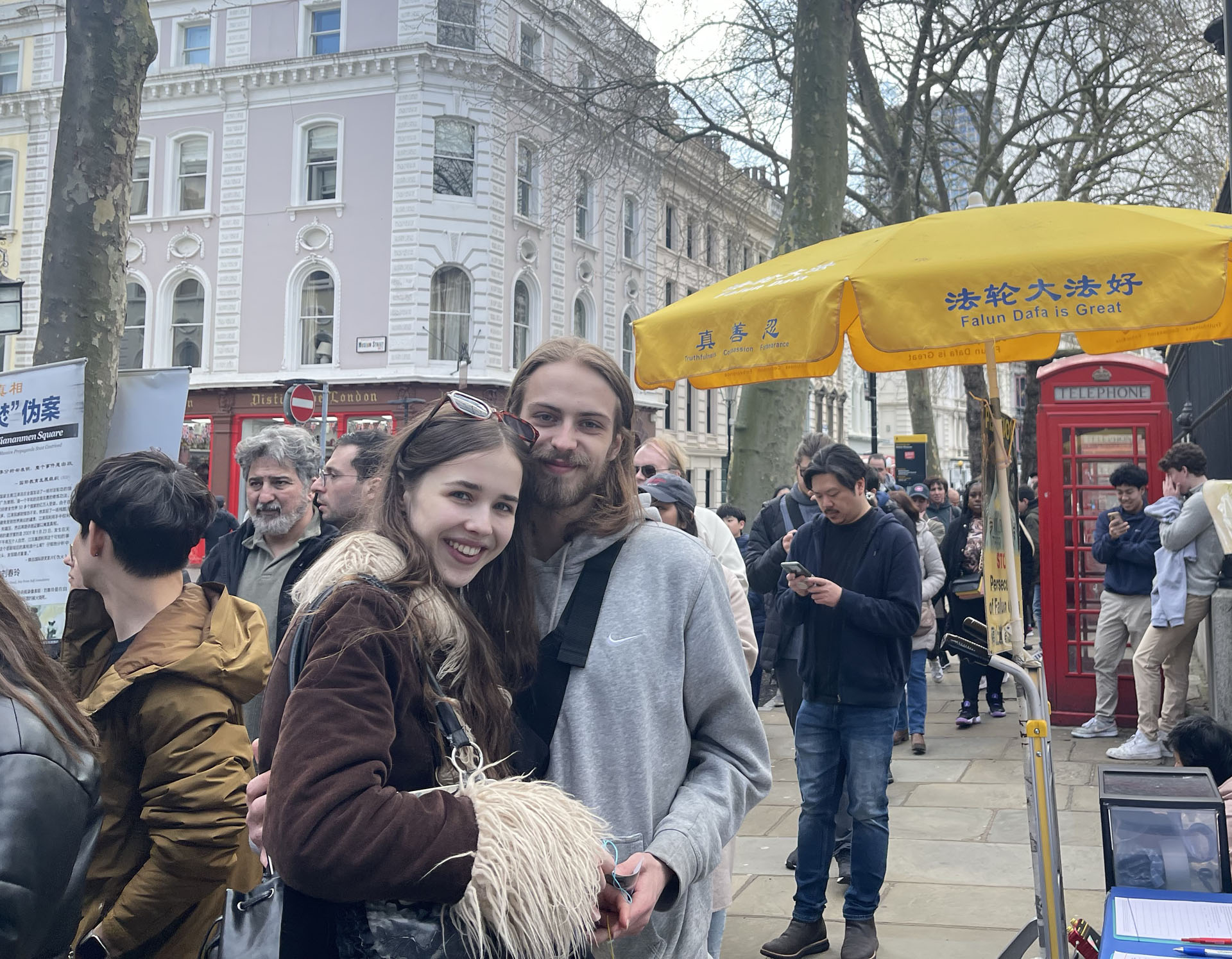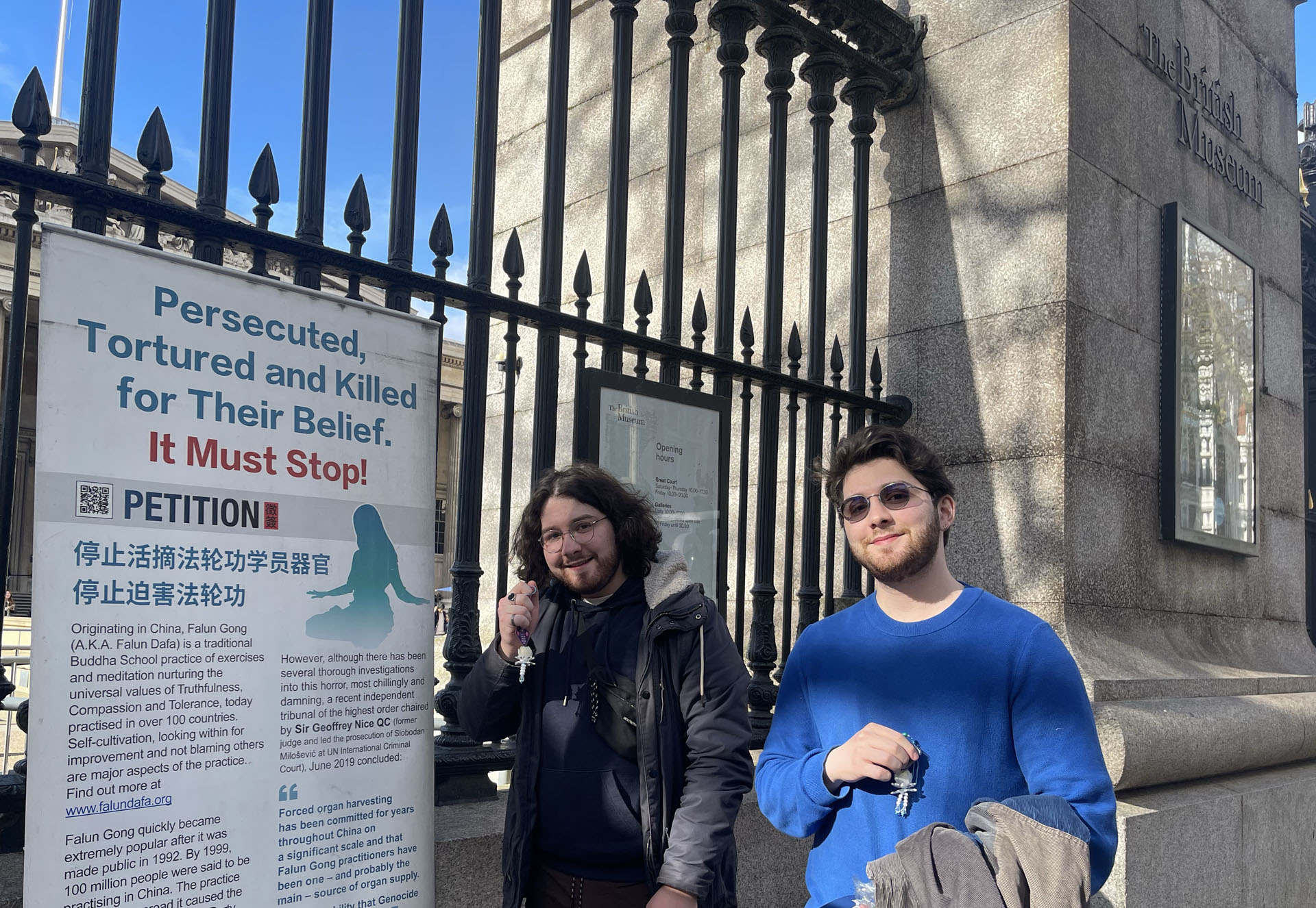 拥有二百七十年历史的大英博物馆是世界上最大的博物馆之一,地处伦敦市中心。藏有八百多万件展品和六十个展厅,每年迎接七百万世界各地的观光客。法轮功学员在这里讲真相已有十余年之久。夏天旺季的时候,前、后门外都有展位,很多人知道真相后支持反迫害签字,还时常听到有行人喊出:“法轮大法好!”