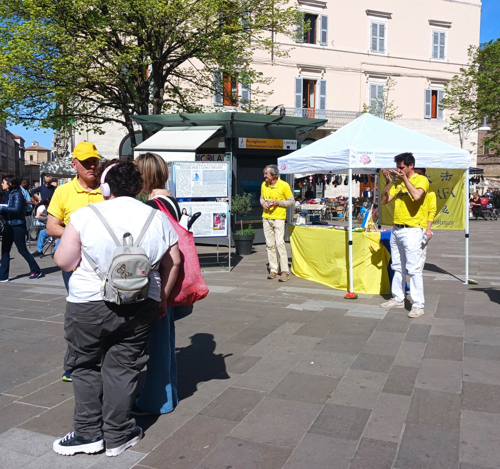 一名不会说意大利语但在安科纳大学学习的伊朗年轻人,走近真相摊位并用英语与学员交谈,他告诉学员他是在互联网上了解到法轮大法的。他很惊讶地在安科纳也见到了学员,他在学员的展位附近停留了很长时间才离开。