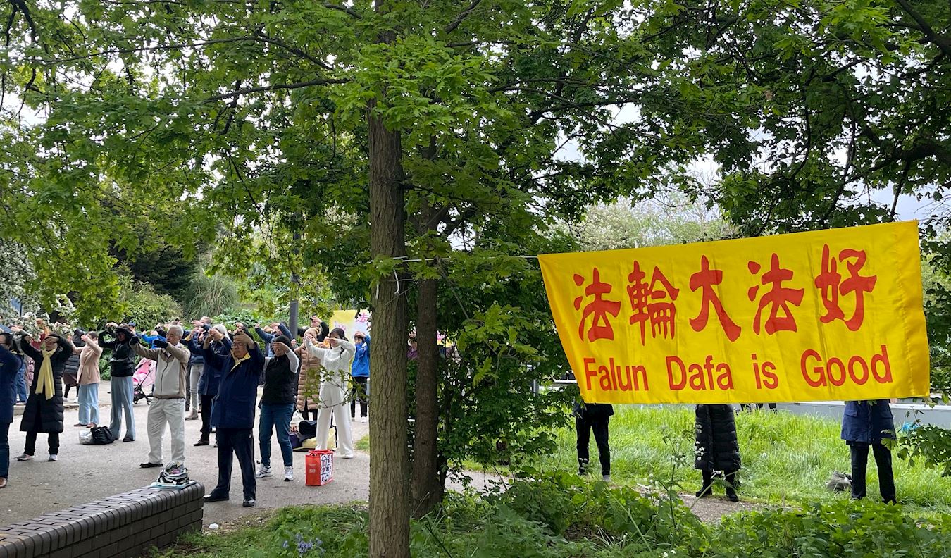 ![]() 图1~2:法轮功学员在东伦敦公园里集体炼功 |