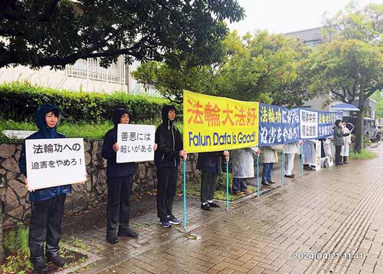 四月二十一日,熊本地区的法轮功学员在位于日本九州的福冈和长崎的中领馆前,举行纪念“四·二五”和平上访二十五周年集会。