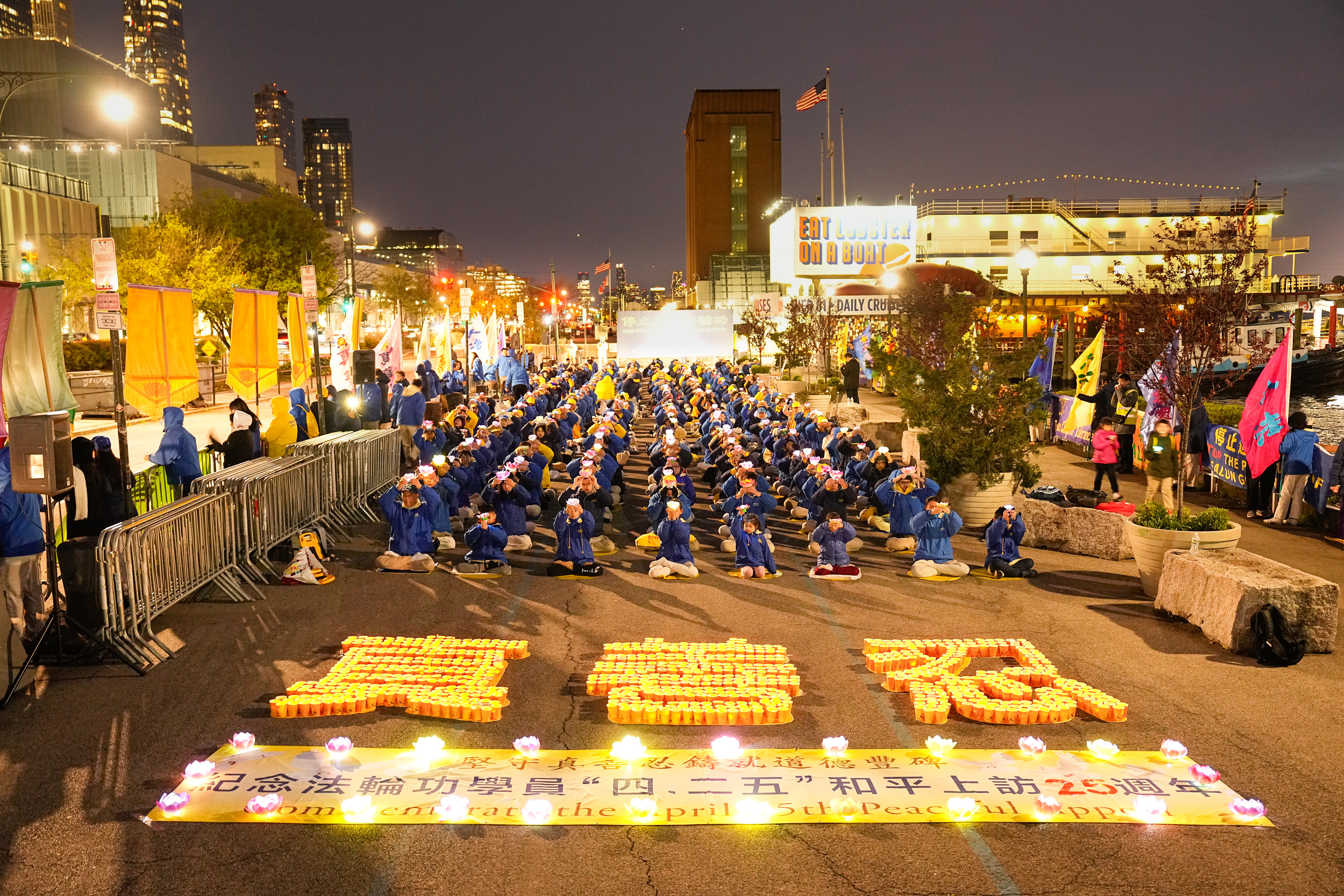 夜幕低垂,法轮功学员们点起烛光,拼成“真、善、忍”字样,手中的盏盏莲花灯,纪念着“四·二五”请愿事件中,法轮功学员展现的平和善良,也悼念二十五年来,坚守信仰而被迫害致死的修炼人。