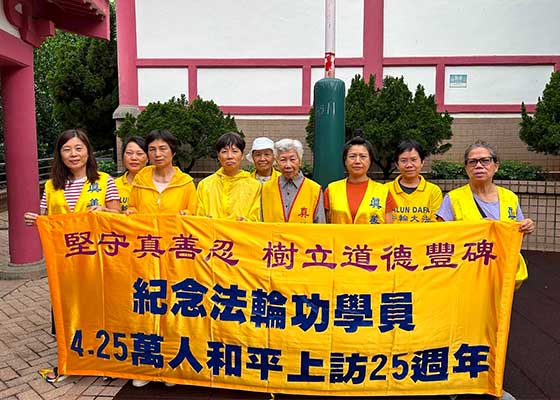 “四·二五”万人上访二十五周年前夕,香港法轮功学员举起横幅合照纪念。学员表示,“四·二五”上访体现法轮功学员和平反迫害的坚韧精神,意义重大。