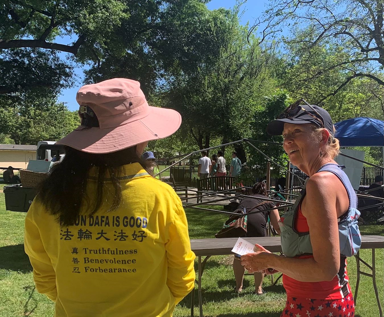 两位中国游客看到很多西方法轮功学员在炼功,他们分别和法轮功学员交谈许久。一位游客在听的过程中,笑着频频点头,之后同意退出中共的相关组织。