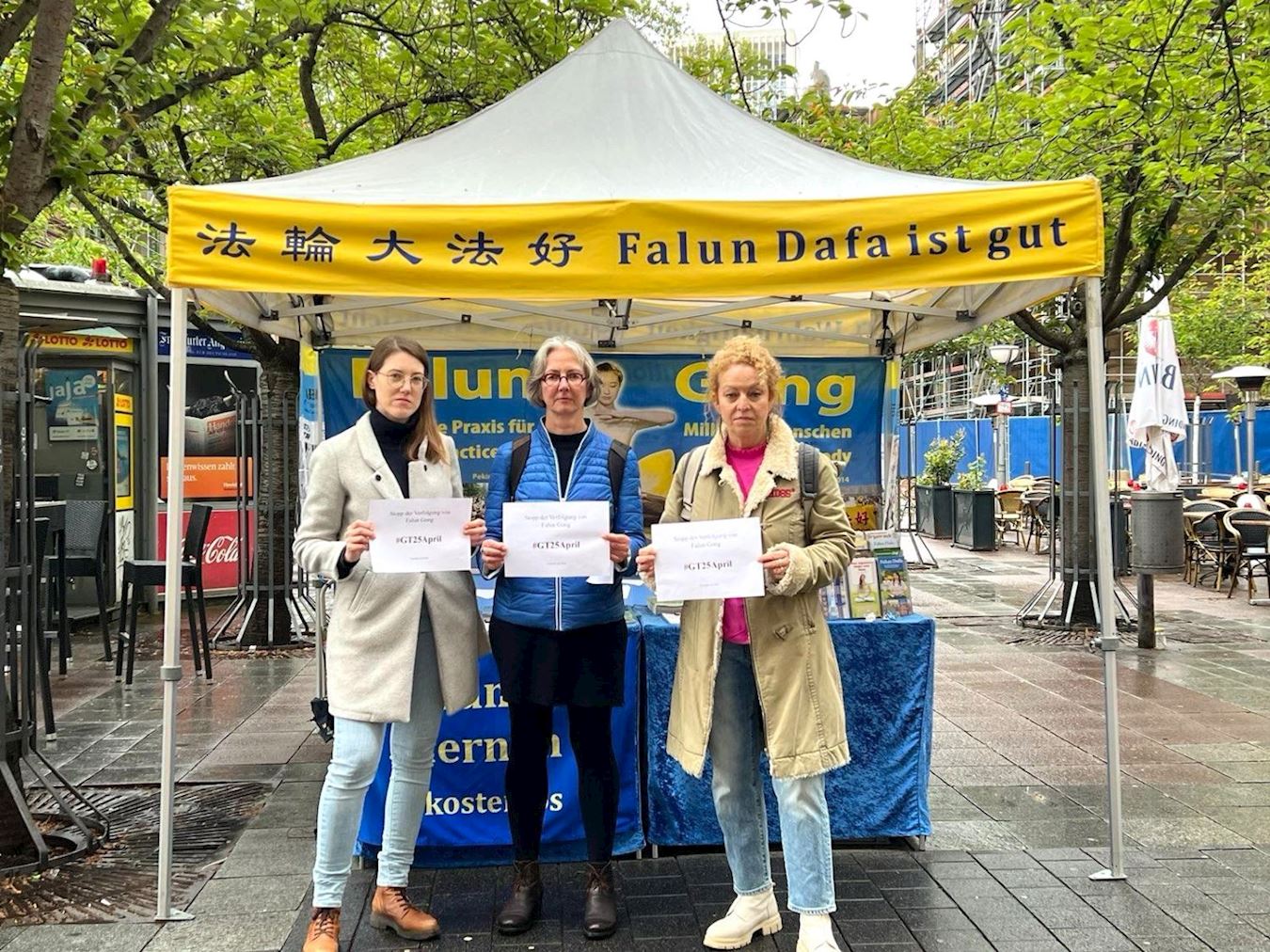 法兰克福黑森州州议会三位绿党议员来到法轮功学员活动场地,并举牌表示支持“四·二五”纪念活动。她们分别是,玛丽安·达尔科(Miriam Dahlke)州议员、卡琳·米勒(Karin Müller)前州议会副议长(今年初退休)、玛缇娜·费徳麦亚(Martina Feldmayer)州议员。