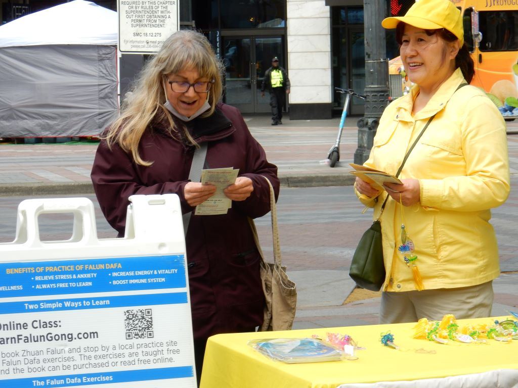 一位二十多岁的留学生与法轮功学员交谈了很长时间,他说自己对法轮功不了解。学员详细给他解释了什么是法轮功,为什么中共要迫害法轮功,法轮功学员是如何通过各种方式努力不懈地反迫害。他听的很认真,并表示他知道共产党不好,家里人跟他讲过,他的爷爷是一名作家,当年写了书却不敢发表,文革时被抄过家。