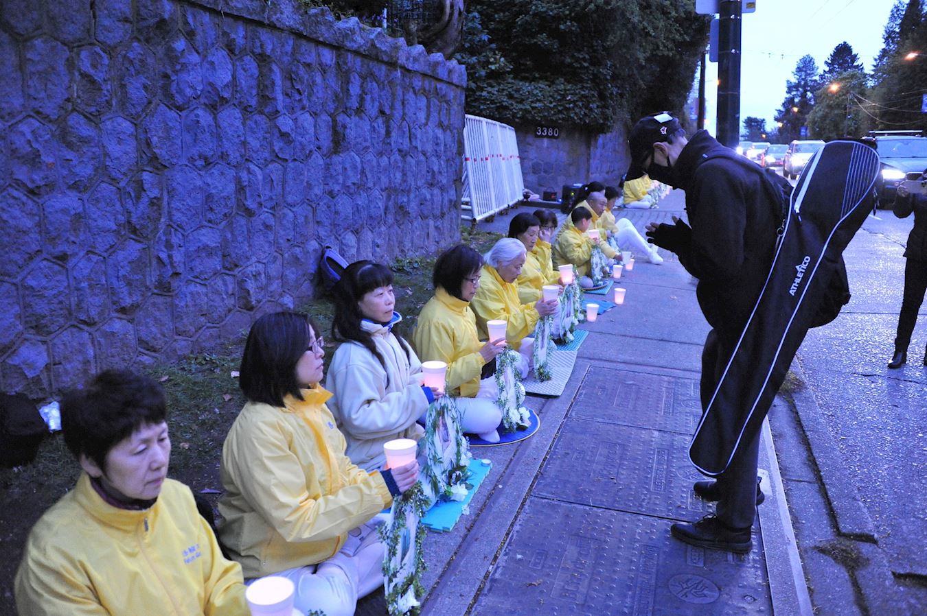 二十四日晚在中领馆前,香港裔约翰(John)手持加拿大国旗来到现场,并向每一次法轮功学员合十鞠躬表达自己的敬意。