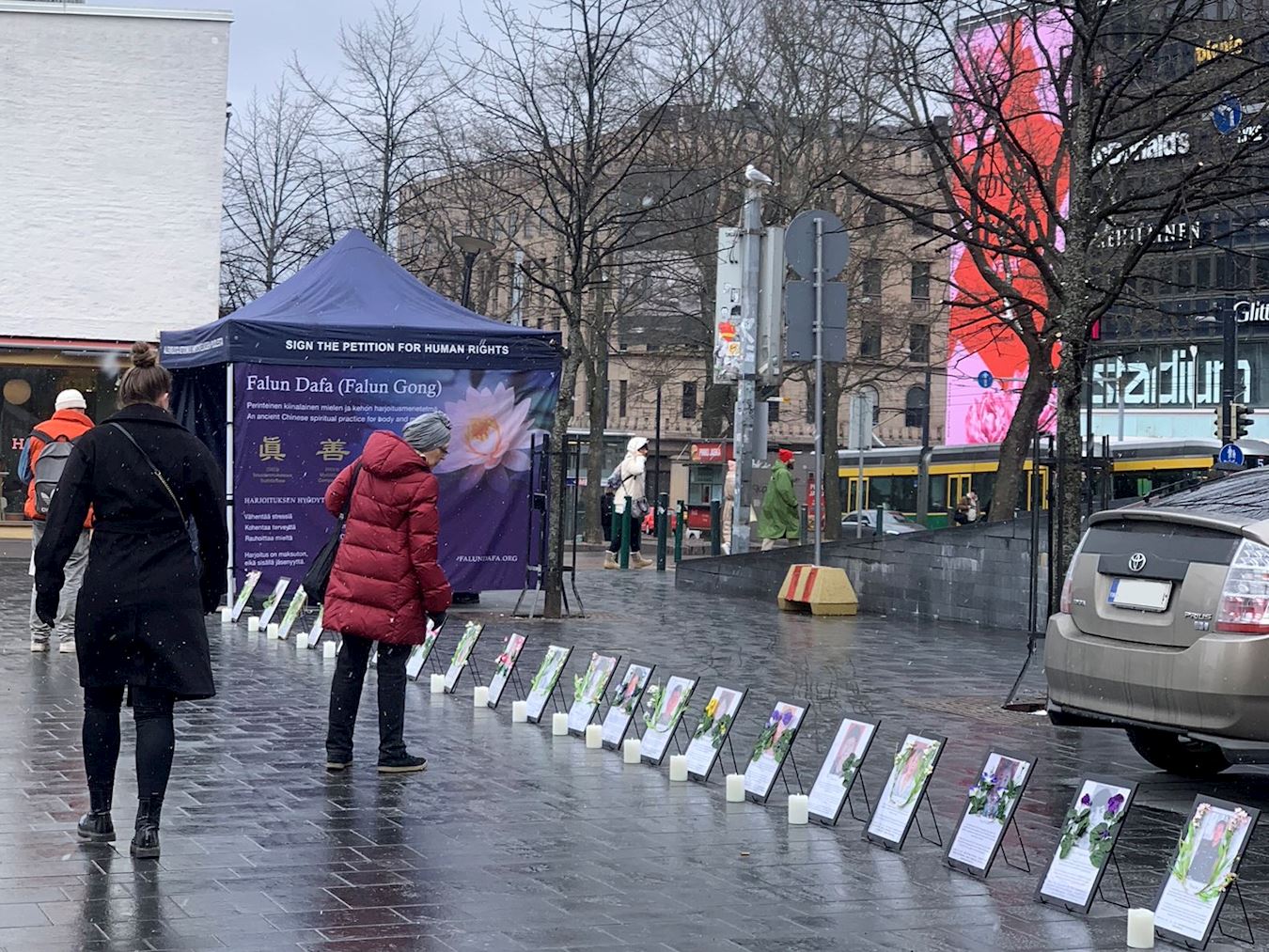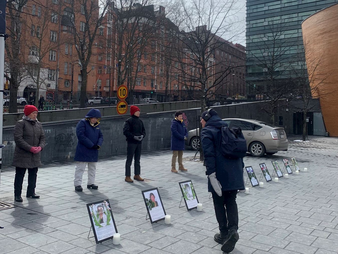 四月二十日的赫尔辛基市中心,学员将部分被迫害致死的法轮功学员的遗像摆在地上,并附上说明。当天天气阴晴不定,期间还下起了小雪,但仍然很多人驻足想要了解真相。