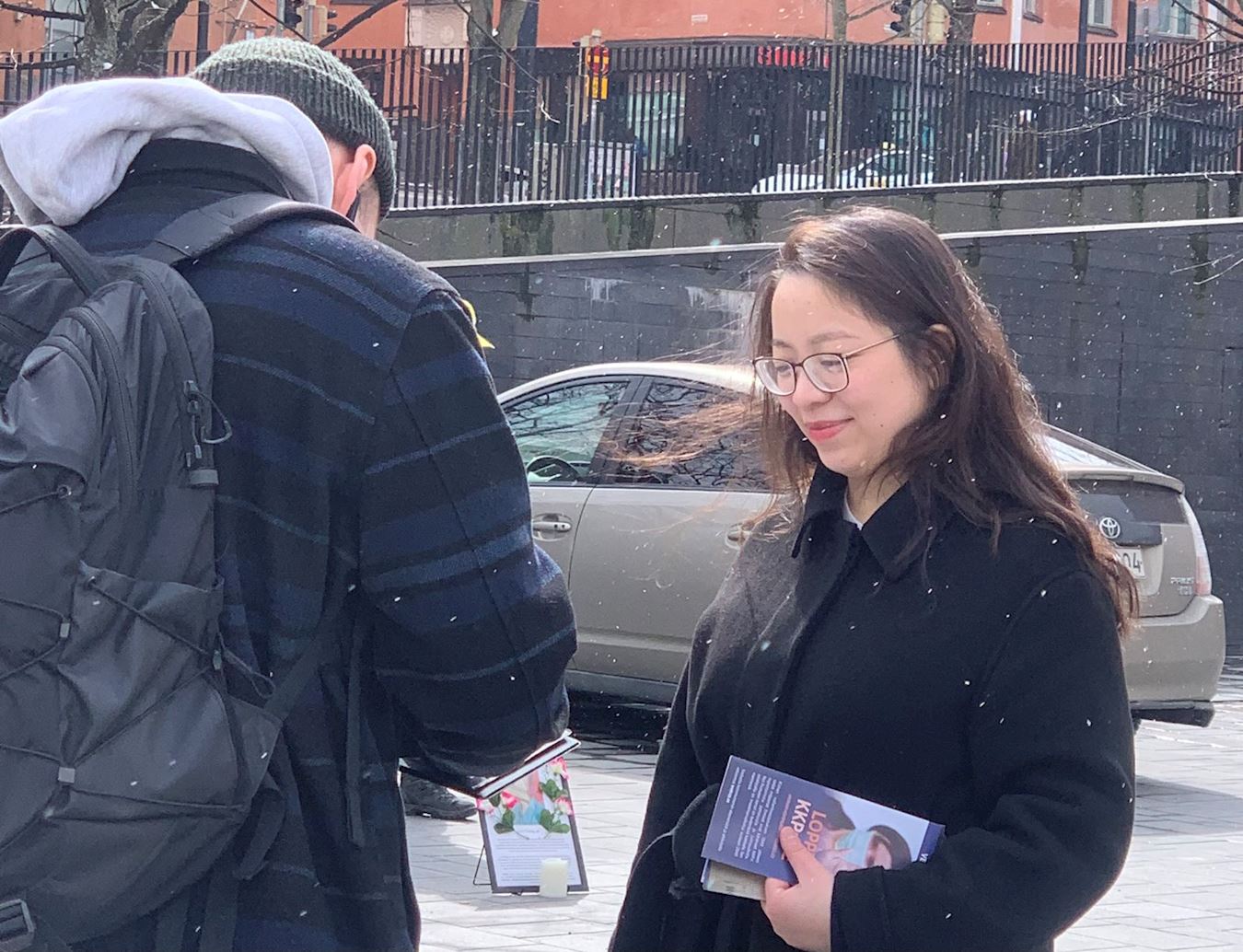 一位附近的居民正好购物回家,并与学员聊起她五年前曾去中国工作一段时间。她知道法轮功学员被中共残酷活摘器官的罪行,并对目前中国的人权现状表示担忧。她说:“谢谢分享这么多重要的信息,谢谢你们的坚持!你们做了很重要的事!”