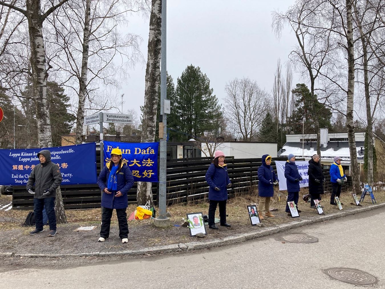 四月二十五日,部分芬兰法轮功学员在赫尔辛基中共驻芬兰使馆前举行集会,纪念“四·二五”和平上访二十五周年。