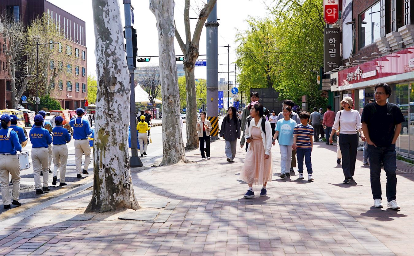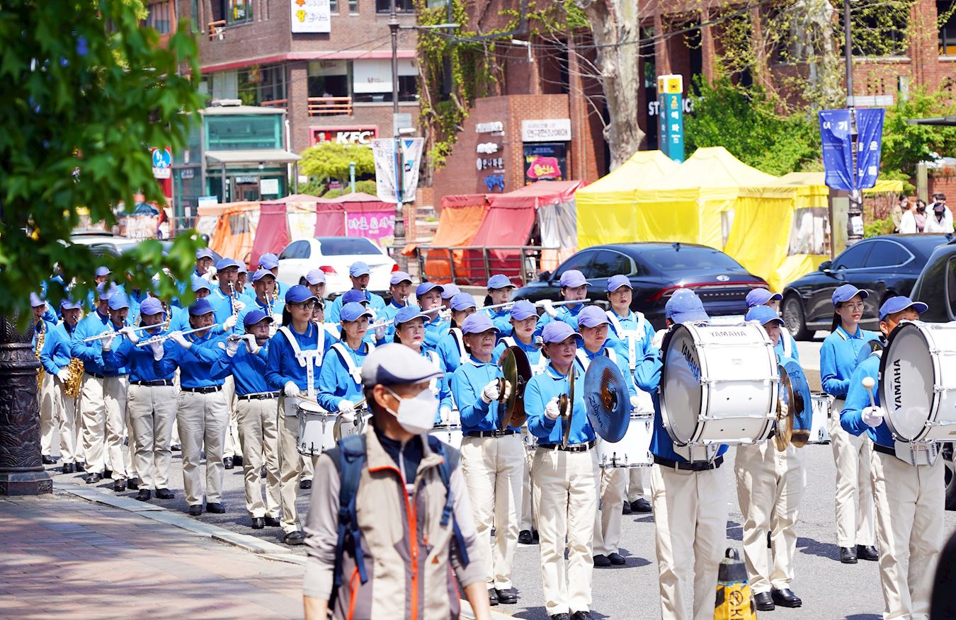 【明慧网二零二四年四月二十七日】二零二四年四月十四日,在韩国首尔市钟路区大学路马罗尼埃公园里,响起了天国乐团的演奏。由法轮功学员组成的天国乐团在游行路途中散发出的纯正能量,带给了当地市民真、善、忍的美好与体验。
