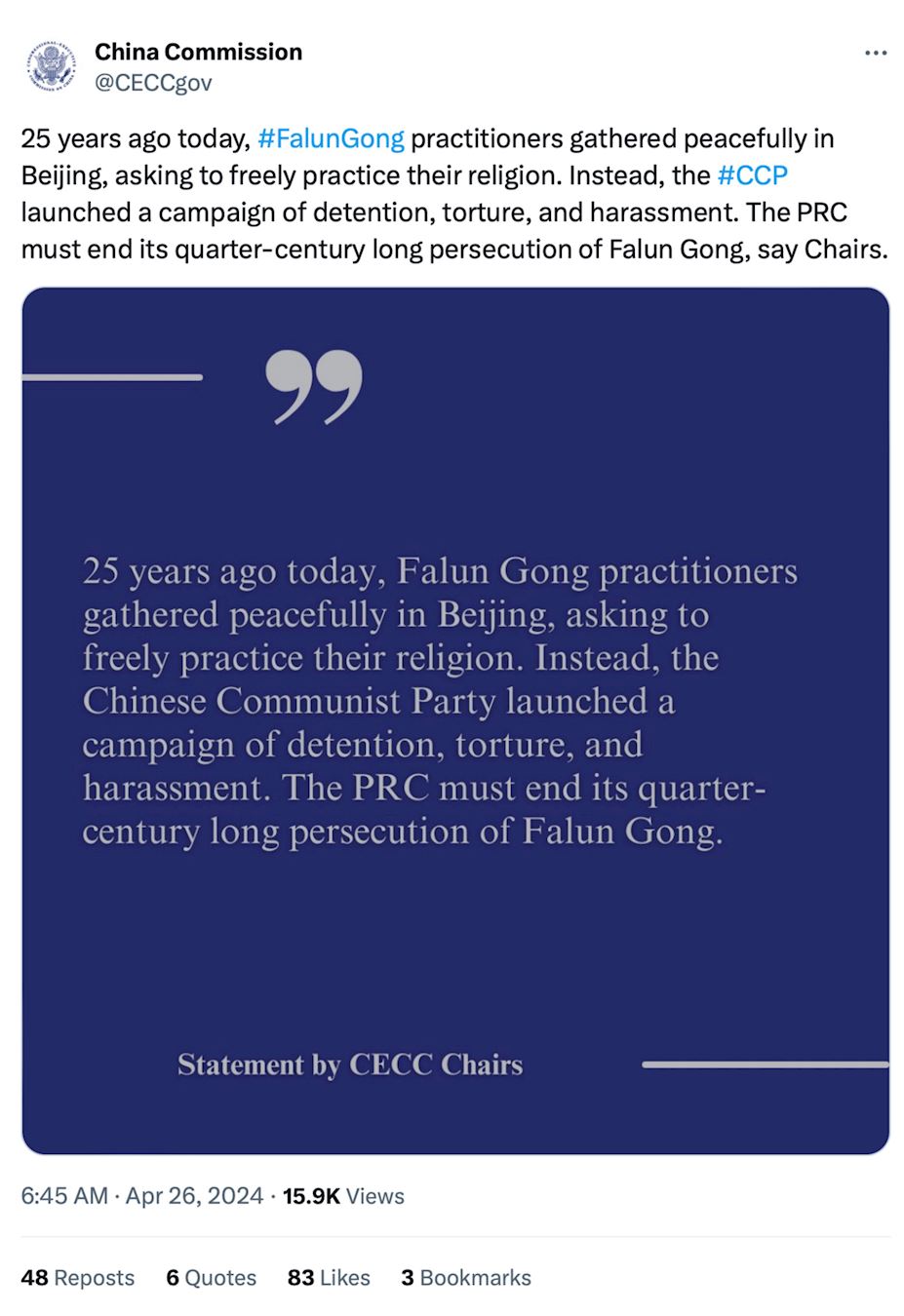 美国国会及行政当局中国委员会(CECC)主席、新泽西州联邦众议员克里斯·史密斯(Chris Smith)和联合主席、俄勒冈州联邦参议员杰夫·默克利(Jeff Merkley)在声明中说:“二十五年前的今天,法轮功修炼者和平地聚集在北京,要求自由实践他们的信仰。然而中共却对他们发动了一场拘留、酷刑和骚扰运动,中共必须停止对法轮功长达四分之一世纪的迫害。”
