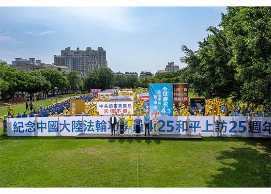 四月二十七日下午,来自台湾中部约千名法轮功学员,于台中市惠来公园举办“纪念四·二五中国法轮功学员万人和平上访二十五周年”记者会以及真相图片展和反迫害遊行。