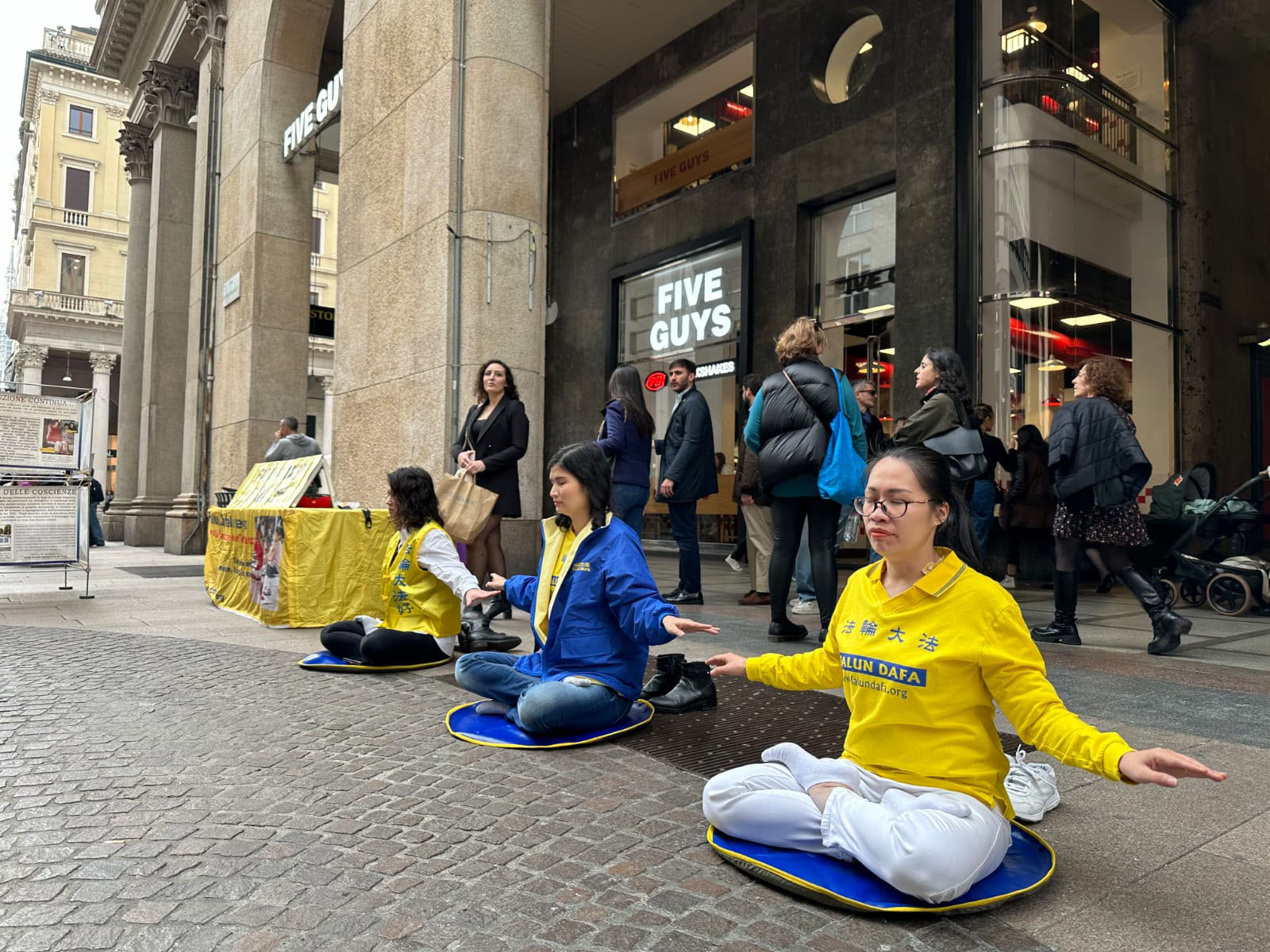 二零二四年三月二十三日星期六,米兰法轮功学员在米兰市中心,托罗画廊/维托里奥·埃马努埃莱二世广场(Galleria del Toro/Piazza Vittorio Emanuele II)开展弘法、炼功、讲真相活动。