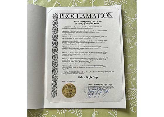 在世界法轮大法日到来之前,美国俄亥俄州代顿市市长褒奖法轮大法,宣布二零二四年五月十三日为代顿市的“法轮大法日”。