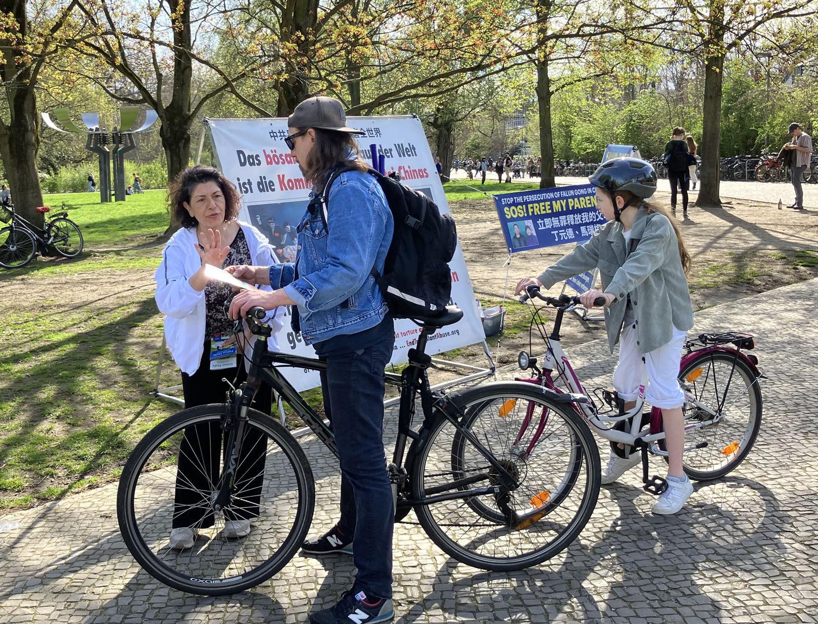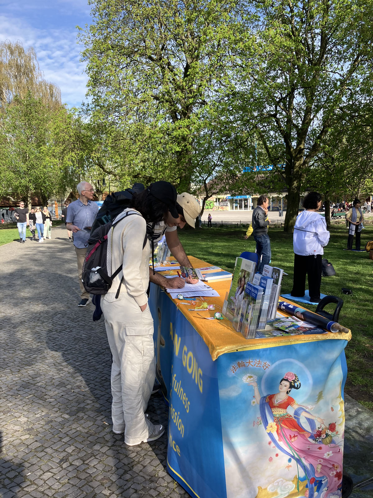 【明慧网二零二四年四月八日】“在哪里可以签名支持你们?”“请问在哪里可以学炼法轮功?“这都是三五成群的柏林市民进入东柏林特雷普托公园(Treptower Park)时,向法轮功学员们提出的问题。