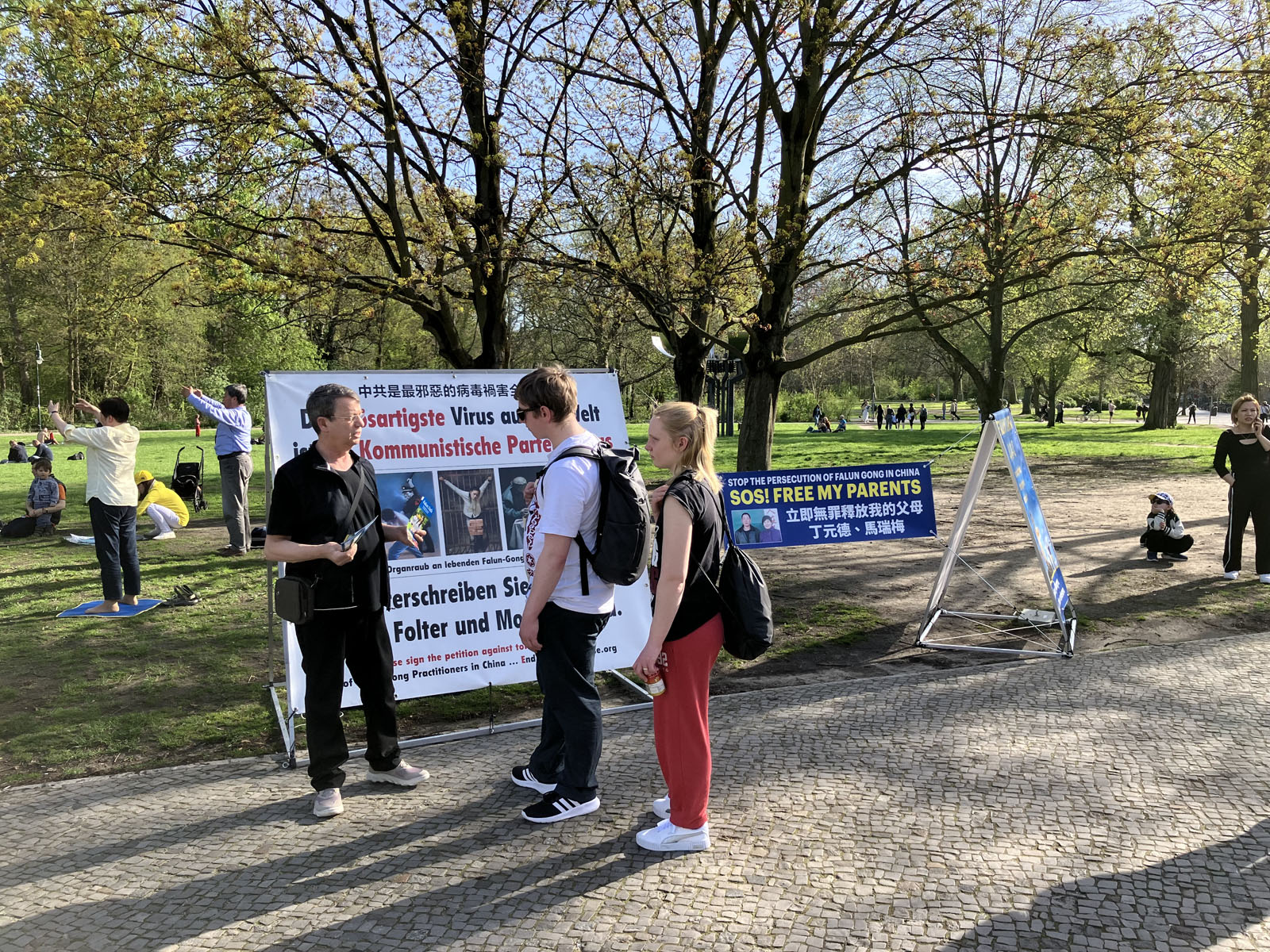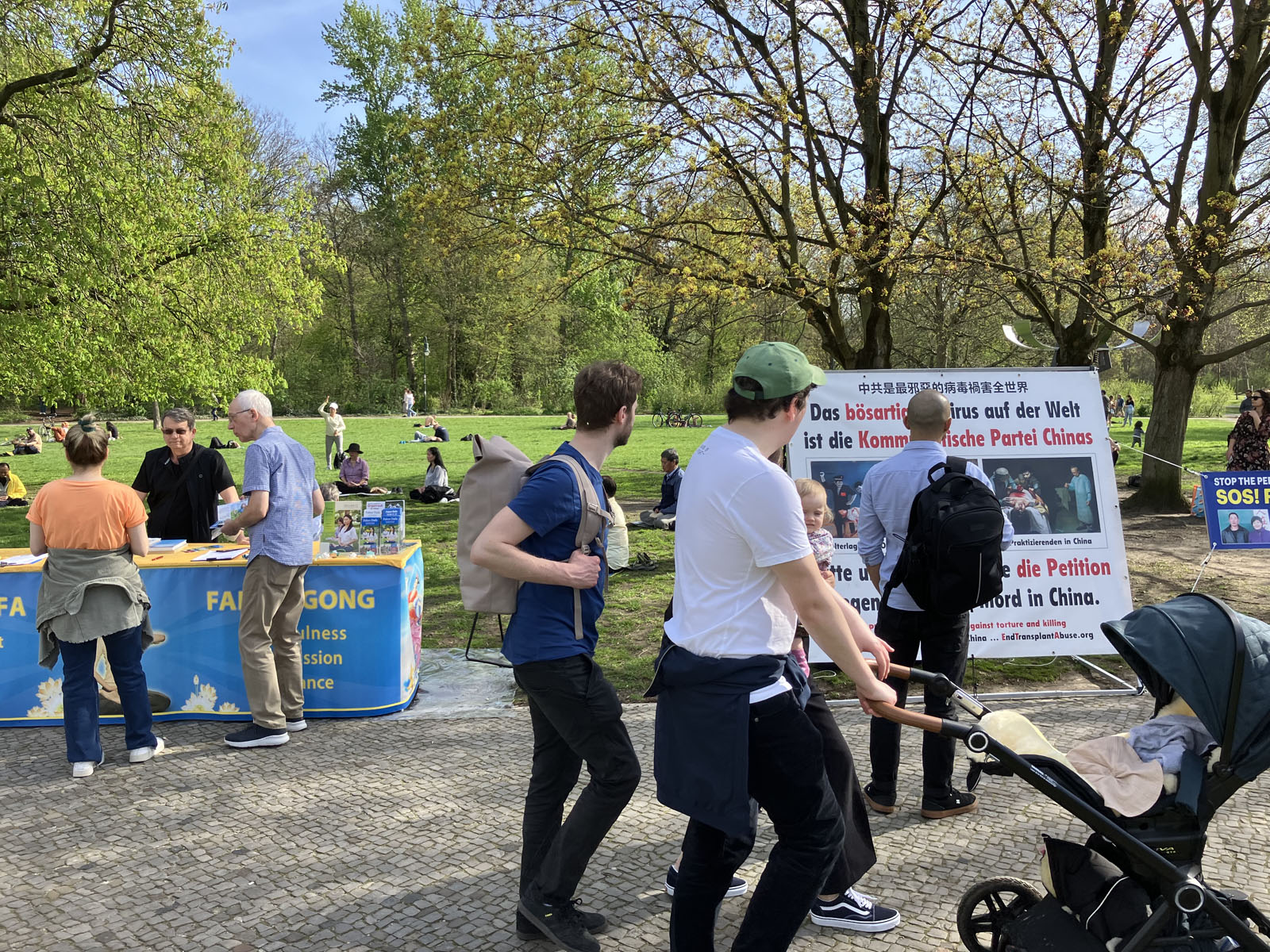 从今年的复活节周末开始,每周日下午,柏林部分法轮功学员继续在这个城市公园组织信息日活动,有的法轮功学员围成一圈打坐炼功,有的手持真相传单,微笑着和进入公园的人们打着招呼。大大小小的横幅和展板吸引着人们停留驻足,并和法轮功学员们交谈着,不少游客还在制止中共活摘人体器官的请愿书上签名。