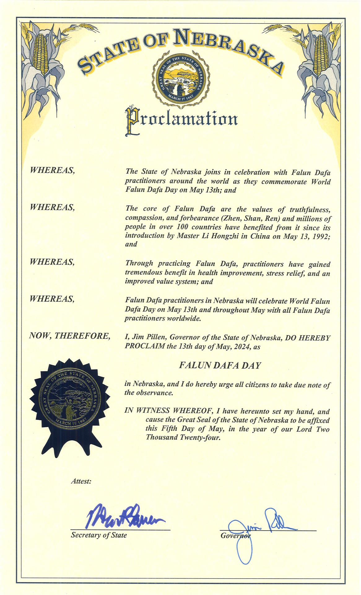 因此, 我吉姆·皮伦,内布拉斯加州州长,特此宣布,二零二四年五月十三日为内布拉斯加州“法轮大法日”。