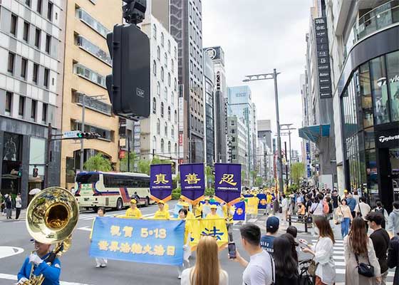 五月十二日,日本法轮功学员在东京中心繁华街区举办游行活动,庆祝法轮大法弘传世界三十二周年,恭贺法轮大法创始人李洪志师父华诞。