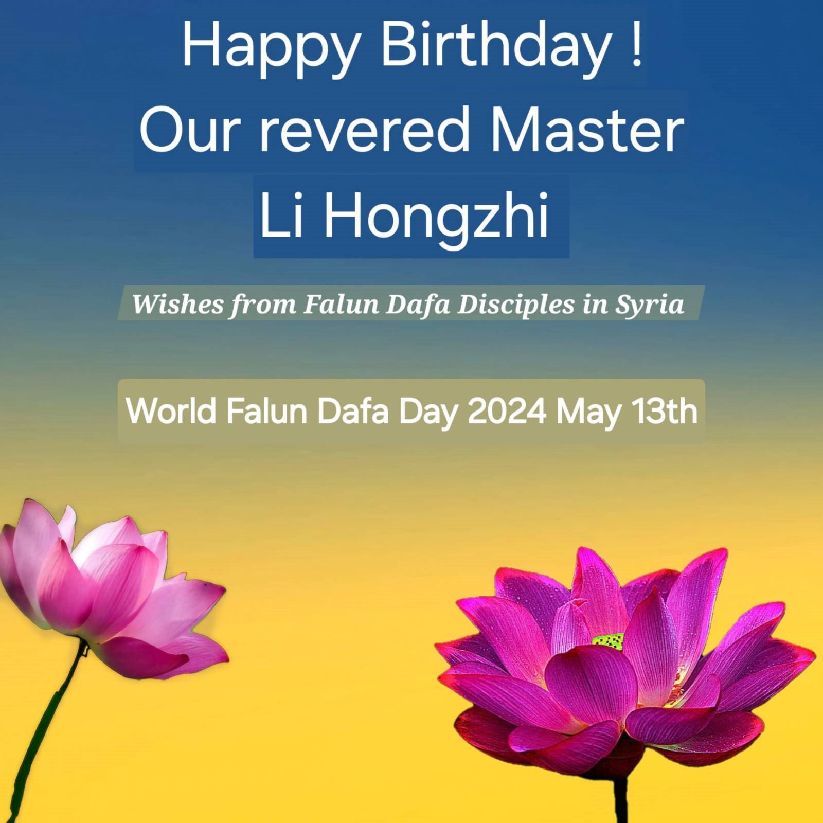 在庆祝世界法轮大法日之际,巴勒斯坦法轮功学员祝尊敬的李洪志师父生日快乐,吉祥如意!