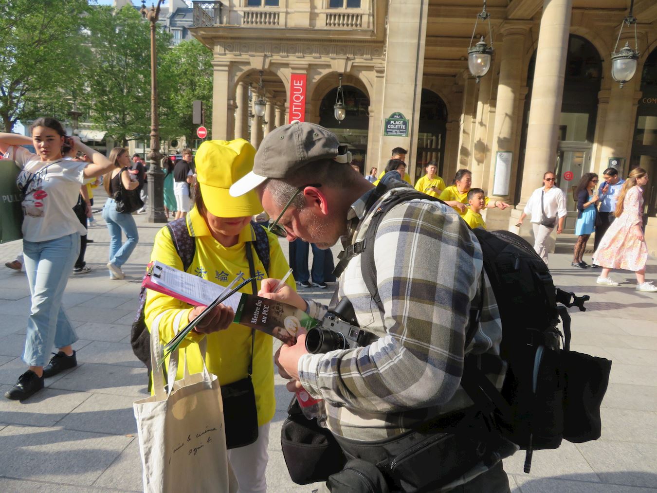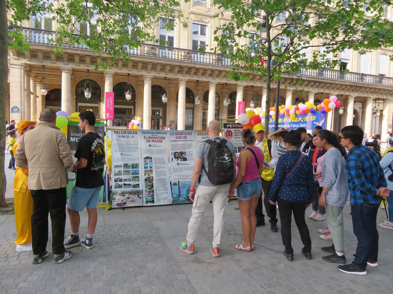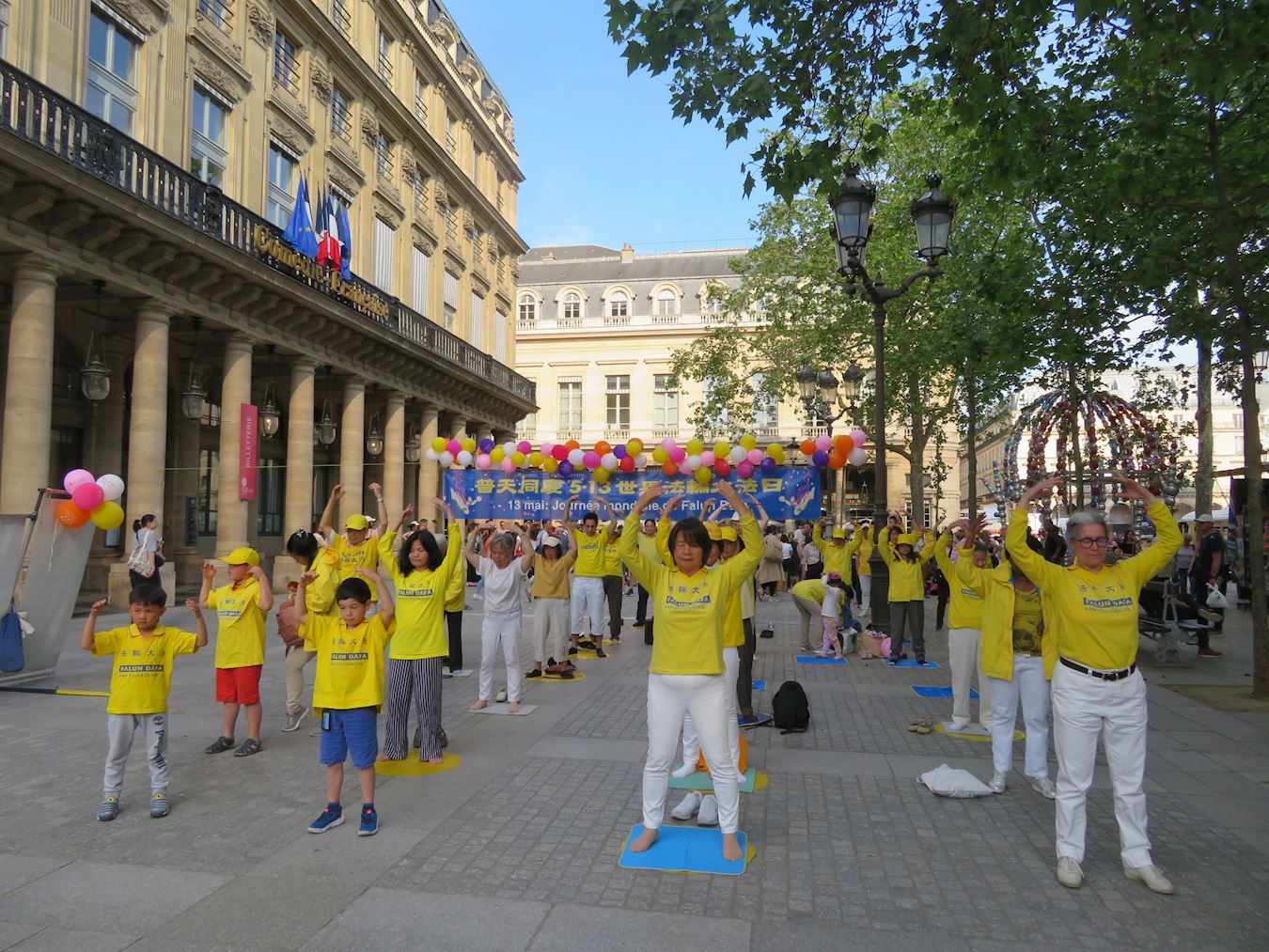 为庆祝法轮大法日,二零二四年五月十二日,法国西部地区部分大法弟子在雷恩(Rennes)市进行了集体炼功活动。五月十一日傍晚,巴黎部分大法弟子在卢浮宫旁的柯莱特广场(Place Colette)举行了集体炼功和讲真相活动。活动吸引了来往的民众和游人。看到法轮功学员祥和的功法表演,人们赞扬真、善、忍是人们在生活中应该拥有的价值。
