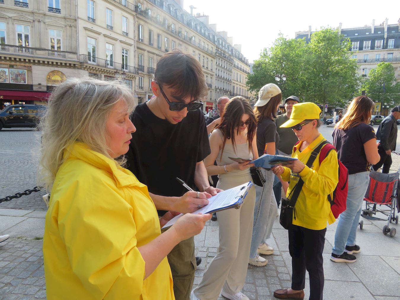 ![]() 图2~3:巴黎部分大法弟子在巴黎柯莱特广场(Place Colette)恭祝师父生日快乐。 |