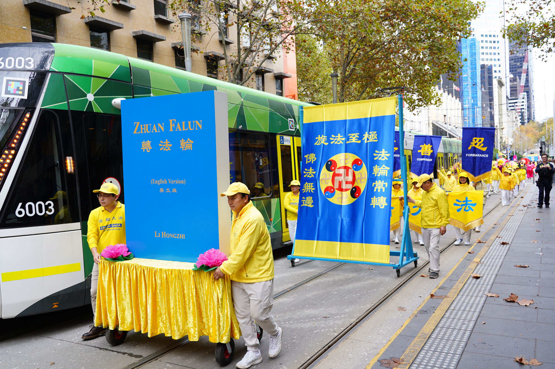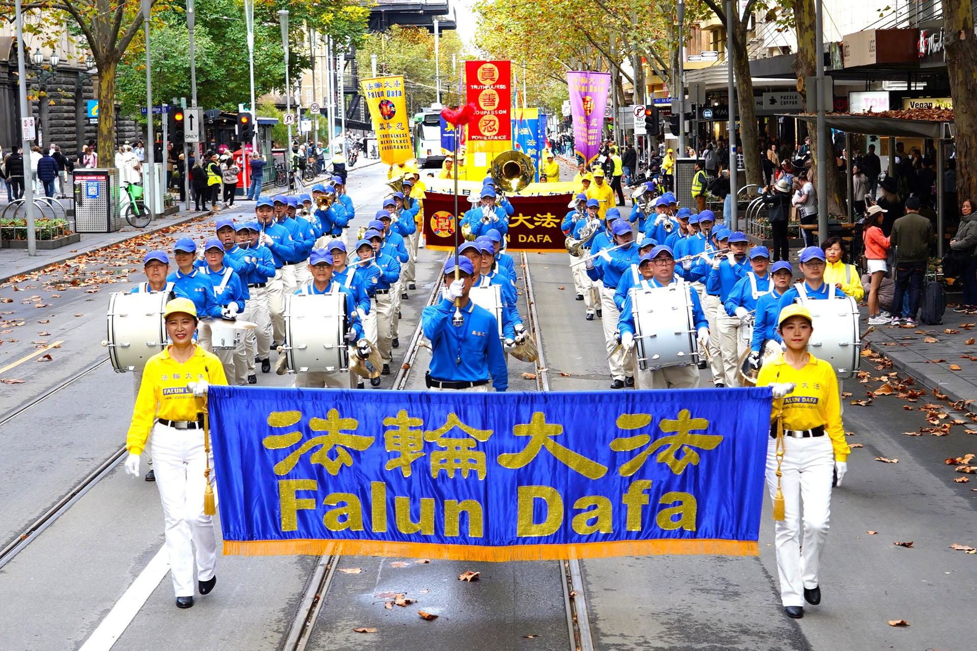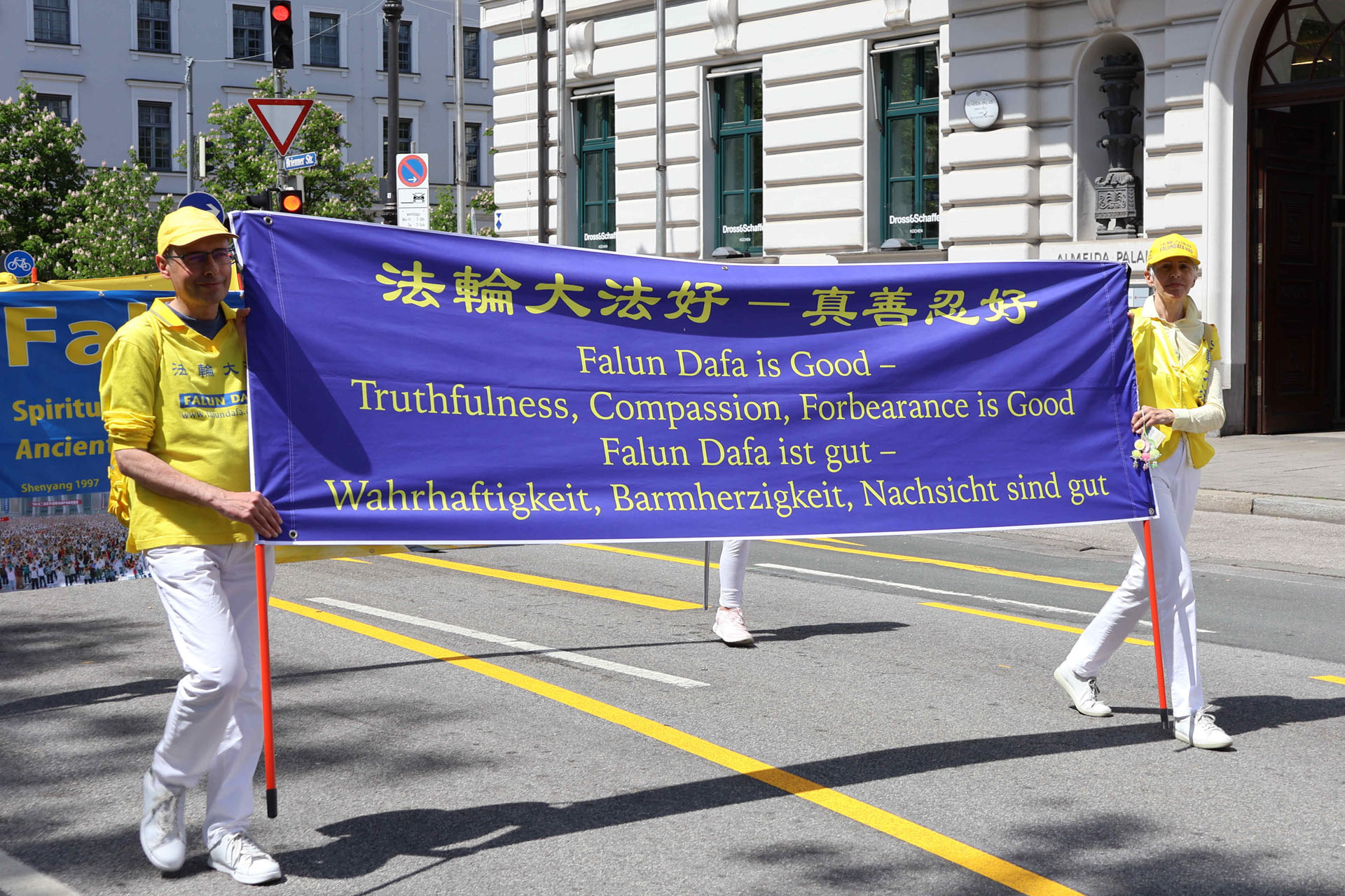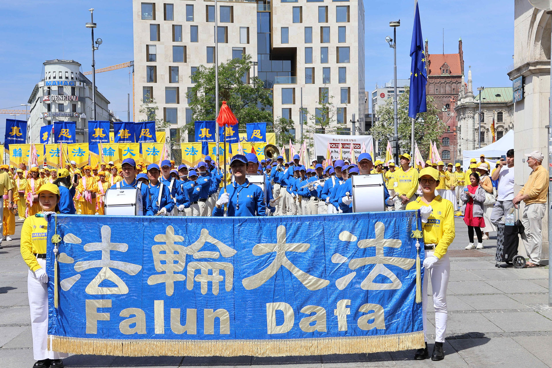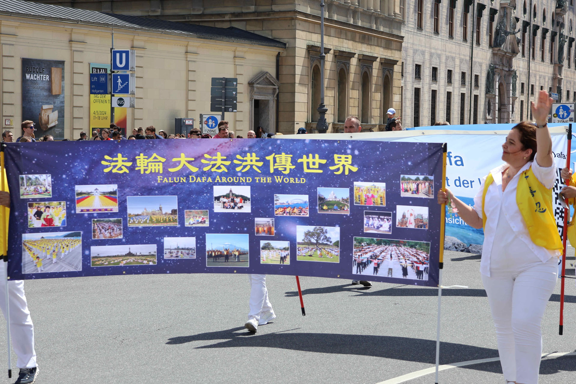 集会结束后,法轮功学员开始游行前往市政府所在的玛琳广场(Marienplatz)。队伍由欧洲天国乐团开道,随后是展现“庆祝世界法轮大法日”的大型横幅。旗队、功法演示方阵和各色的横幅让人看到法轮大法的美好及弘传世界的讯息。