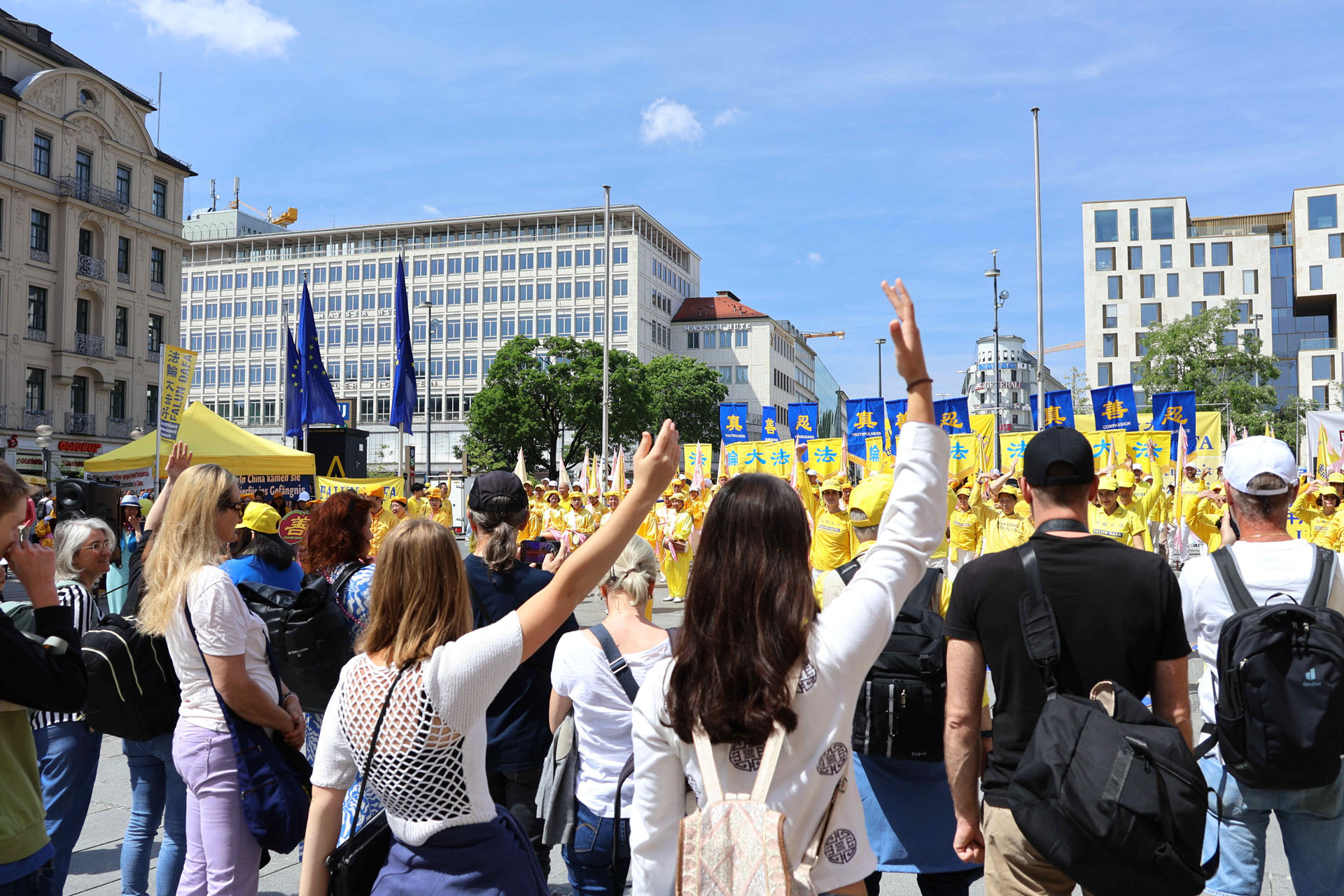 游行队伍环绕老城区,途经市中心最繁华地段,包括慕尼黑四条皇家大道中的三条,音乐厅广场(Odeonsplatz)等。到达玛琳广场后的第二场集会吸引了广场上的众多观众。当天正值市政厅的开放日活动,很多人慕名来参观,还有了意外的收获——法轮大法的讯息。其中少不了中国游客,他们有的赞叹法轮功活动的气势,有的为法轮功竖起了大拇指。